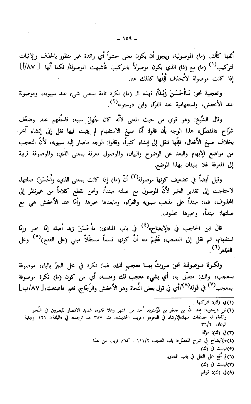 وتعجبية نحو: مَا أحسَنَ زَيْدًا، فهذه الـ (ما) نكرة تامة بمعنى شيء عند سيبويه، وموصولة عند الأخفش، واستفهامية عند الفراء وابن درستويه.
