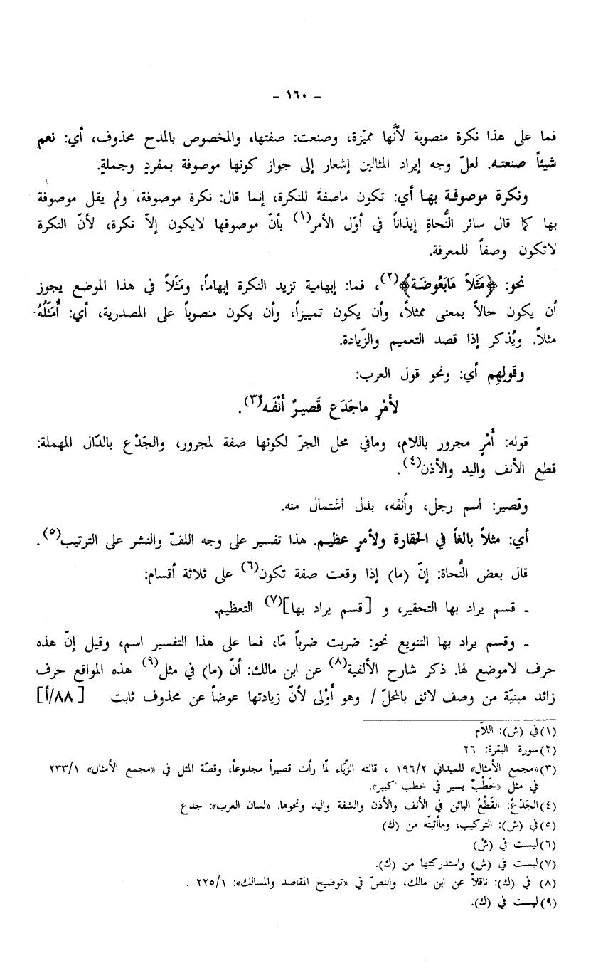 ونكرة موصوفة بها أي: تكون ما صفة للنكرة، إنَّما قال: نكرة موصوفة، ولم يقل موصوفة بها كما قال سائر النُّحاةِ إيذانًا في أوّل الأمر بأنّ موصوفها لا يكون إلا نكرة، لأنَّ النكرة لا تكون وصفًا للمعرفة.