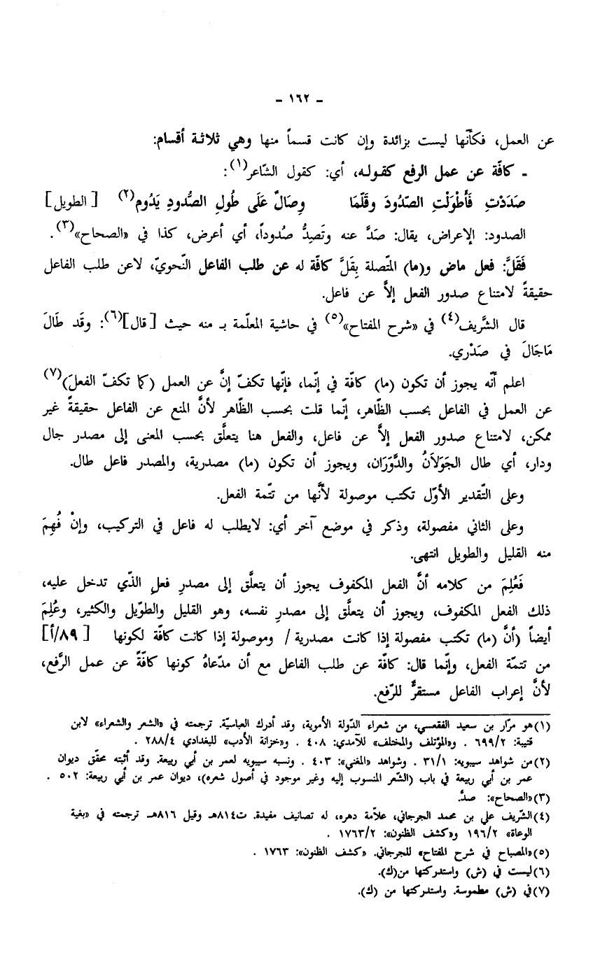 فَعُلِمَ من كلامه أنَّ الفعل المكفوف يجوز أن يتعلَّق إلى مصدرِ فعل الذي تدخل عليه، ذلك الفعل المكفوف، ويجوز أن يتعلَّق إلى مصدرِ نفسه، وهو القليل والطويل والكثير، وعُلِمَ أيضًا (أن (ما) تكتب مفصولة إذا كانت مصدرية وموصولة إذا كانت كافّة لكونها من تتمّة الفعل، وإنمَّا قال: كافّة عن طلب الفاعل مع أن مدّعاهُ كونها كافّةً عن عمل الرَّفع، لأنَّ إعراب الفاعل مستقرٌّ للرفع.