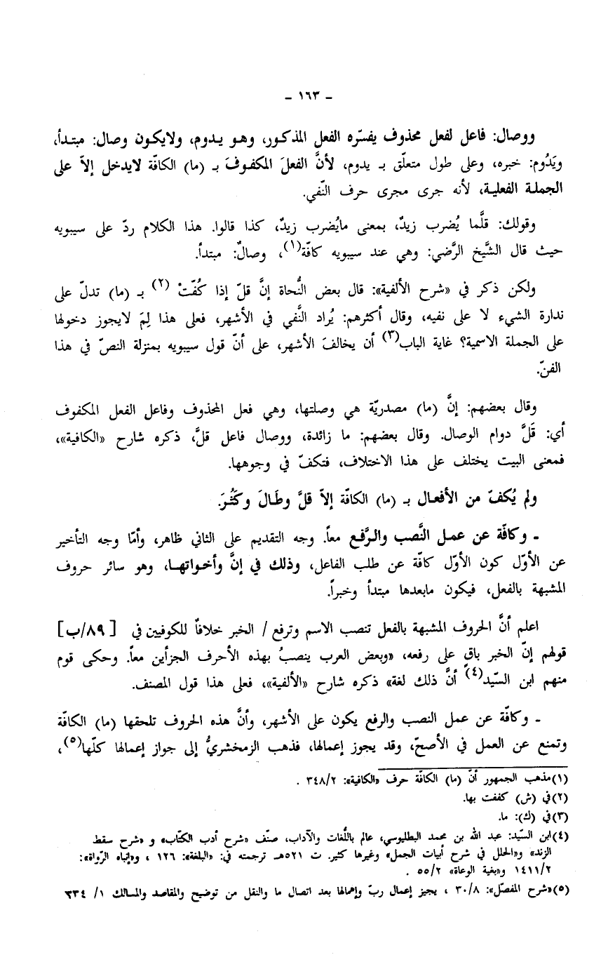 - وكافّة عن عمل النصب والرفع يكون على الأشهر، وأنَّ هذه الحروف تلحقها (ما) الكافّة وتمنع عن العمل في الأصحّ، وقد يجوز إعمالها، فذهب الزمخشريُّ إلى جواز إعمالها كلَّها،