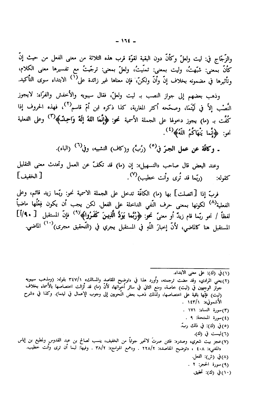 وذهب بعضهم إلى جواز النصب بـ ليت ولعلّ، فقال سيبويه والأخفش والفرّاء: لا يجوز النَّصب إلَّا في لَيْتَمَا، وصحّحه أكثر المغاربة، كذا ذكره ابن أمَّ قاسم، فهذه الحروف إذا كُفَّت بـ (ما) يجوز دخولها على الجملة الإسمية نحو: {إِنَّمَا اللَّهُ إِلَهٌ وَاحِدٌ} وعلى الفعلية نحو: {إِنَّمَا يَنْهَاكُمُ اللَّهُ}.