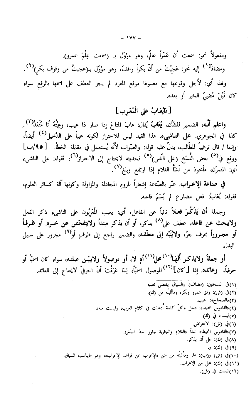 وجملة أن يَذْكُرَ فعلًا نائبًا عن الفاعل، أي: يعيب المُعْرِبُون على الناشئ ذكر الفعل ولا يبحث عن فاعله، عطف على يذكر، أو أن يذكر مبتدأ ولا يتفحّص عن خبره. أو ظرفًا أو مجرورًا بحرف جرّ، ولا يُنبِّه إلى متعلّقه، والضمير راجع إلى ظرفٍ أو مجرور على سبيل البدل.