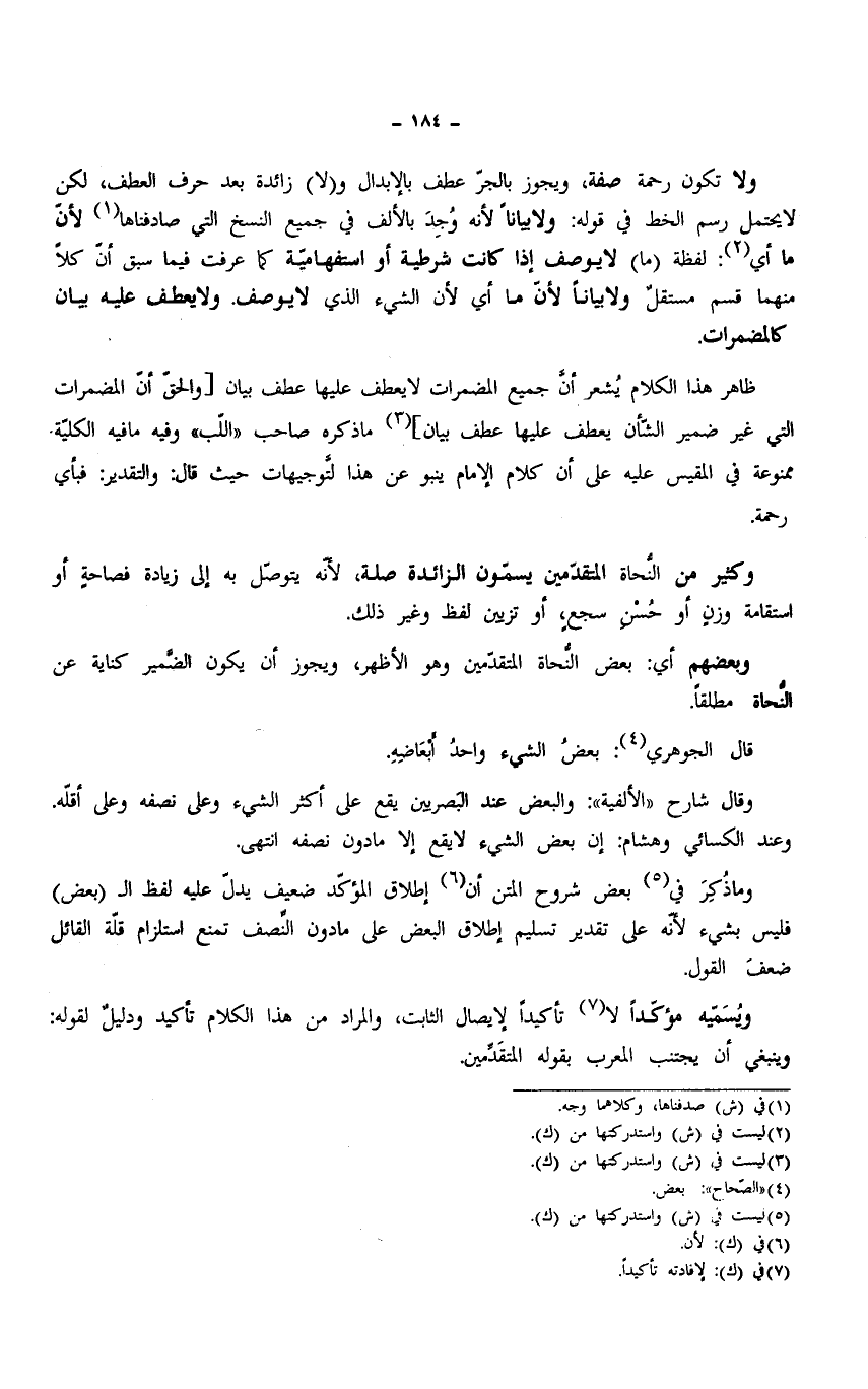 ولا تكون رحمة صفة، ويجوز بالجرّ عطف بالإبدال و (لا) زائدة بعد حرف العطف، لكن لا يحتمل رسم الخط في قوله: ولا بيانًا لأنَّه وُجِدَ بالألف في جميع النسخ التي صادفناها لأنّ ما أي: لفظة (ما) لا يوصف إذا كانت شرطية أو استفهاميَّة كما عرفت فيما سبق أن كلا منهما قسم مستقلٌ ولا بيانًا لأن ما أي لأنَّ الشيء الذي لا يوصف. ولا يعطف عليه بيان كالمضمرات.