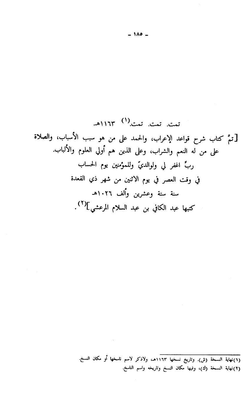 [تمَّ كتاب شرح قواعد الإعراب، والحمد على من هو سبب الأسباب، والصلاة على من له النعم والشراب، وعلى الذين هم أولي العلوم والألباب. ربِّ اغفر لي ولوالديّ وللمؤمنين يوم الحساب في وقت العصر في يوم الإثنين من شهر ذى القعدة سنة ستة وعشرين وألف 1026 هـ كتبها عبد الكافي بن عبد السَّلام المرعشي].
