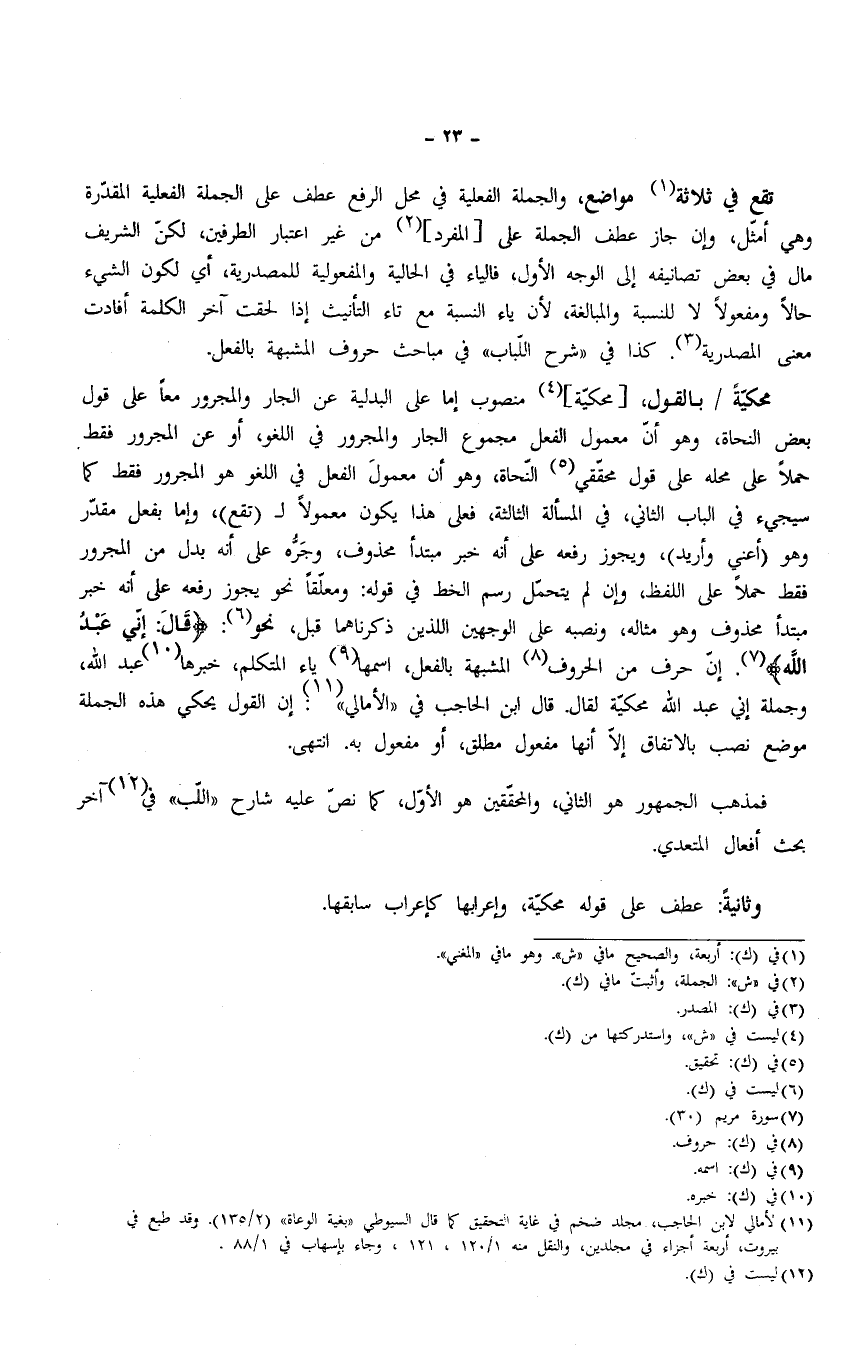 محكيّةً بالقول، [محكيّة] منصوب إما على البدلية عن الجار والمجرور معًا على قول بعض النحاة، وهو أنّ معمول الفعل مجموع الجار والمجرور في اللغو، أو عن المجرور فقط حملًا على محله على قول محقّقي النّحاة، وهو أن معمولَ الفعل في اللغو هو المجرور فقط كما سيجيء في الباب الثاني، في المسألة الثالثة، فعلى هذا يكون معمولًا لـ (تقع)، وإما بفعل مقدّر وهو (أعني وأريد)، ويجوز رفعه على أنه خبر مبتدأ محذوف، وجَرُّه على أنه بدل من المجرور فقط حملًا على اللفظ، وإن لم يتحمّل رسم الخط في قوله: ومعلقًا نحو يجوز رفعه على أنه خبر مبتدأ محذوف وهو مثاله، ونصبه على الوجهين اللذين ذكرناهما قبل، نحو: {قَالَ إِنِّي عَبْدُ اللَّهِ}. إنّ حرف من الحروف المشبهة بالفعل، اسمها ياء المتكلم، خبرها عبد الله، وجملة إني عبد الله محكيّة لقال. قال ابن الحاجب في "الأمالي": إن القول يحكي هذه الجملة موضع نصب بالإتفاق إلا أنها مفعول مطلق، أو مفعول به. انتهى.