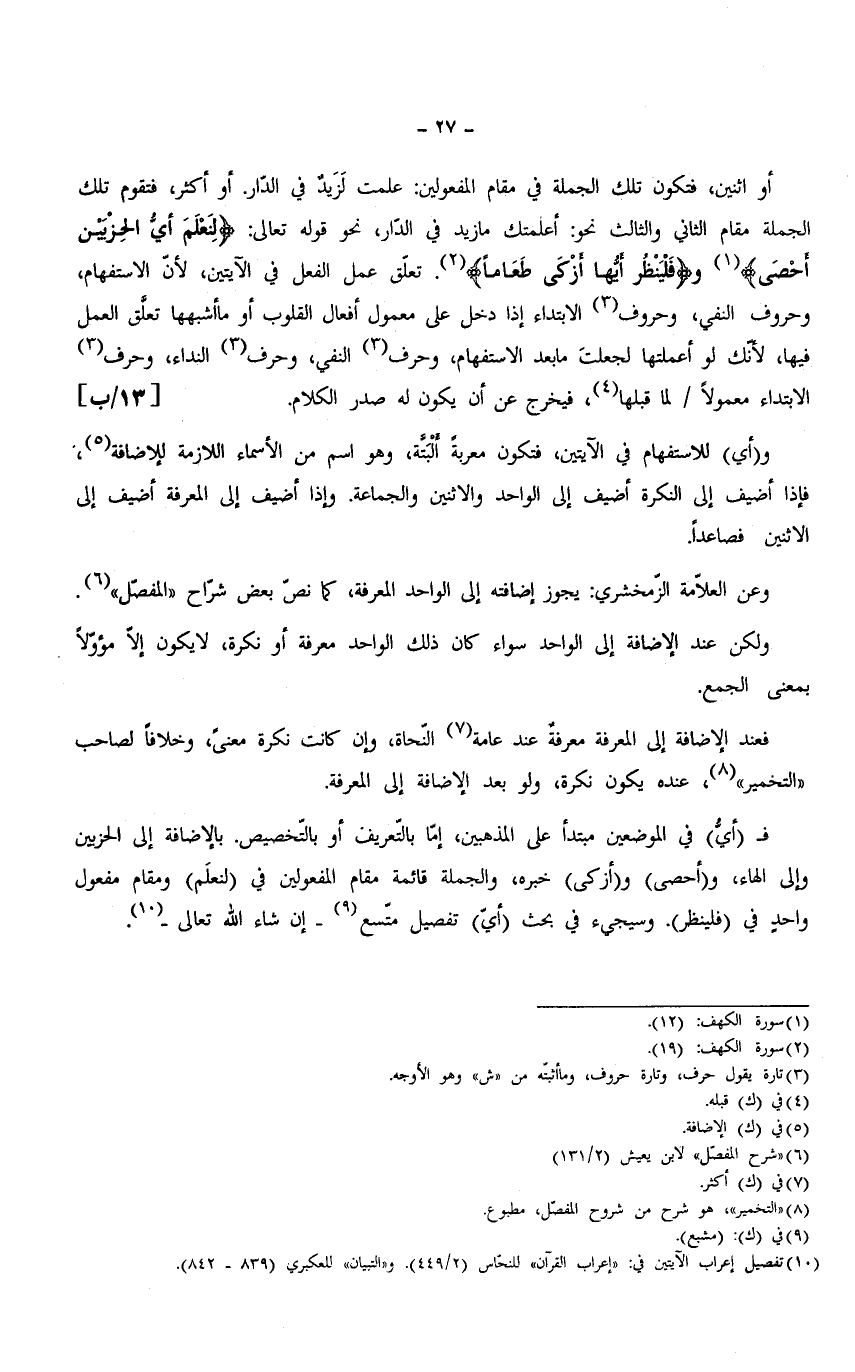 فـ (أيُّ) في الموضعين مبتدأ على المذهبين، إمّا بالتعريف أو بالتّخصيص. بالإضافة إلى الحزبين وإلى الهاء، و (أحصى) و (أزكى) خبره، والجملة قائمة مقام المفعولين في (لنعلَم) ومقام مفعول واحدٍ في (فلينظر). وسيجئ في بحث (أيّ) تفصيل متّسع -إن شاء الله تعالى-.