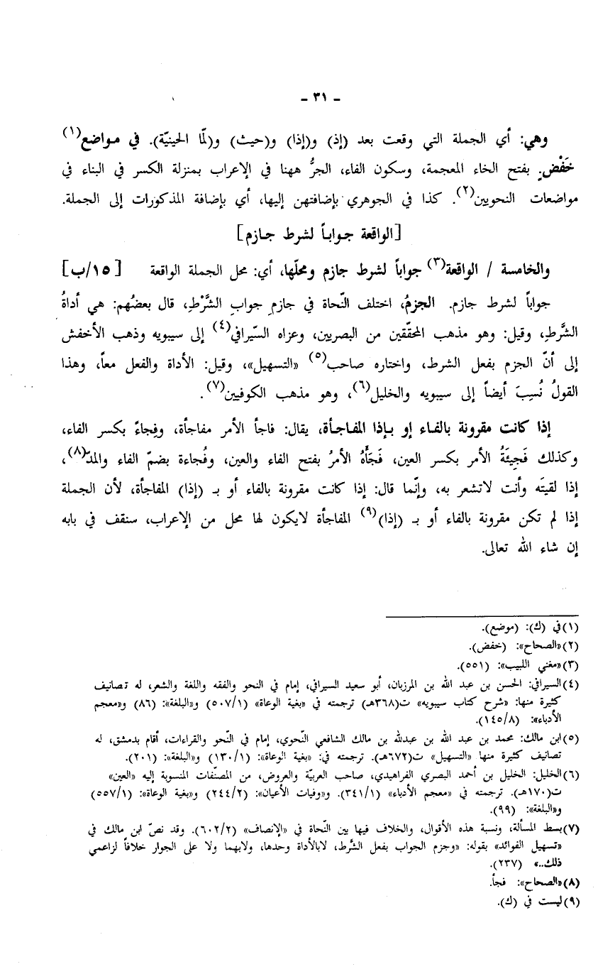 إذا كانت مقرونة بالفاء أو بإذا المفاجأة، يقال: فاجأ الأمر مفاجأة، وفِجاءً بكسر الفاء، وكذلك فَجِيئةُ الأمر بكسر العين، فَجَأهُ الأمرُ بفتح الفاء والعين، وفُجاءة بضمّ الفاء والمدّ، إذا لقيتَه وأنت لا تشعر به، وإنّما قال: إذا كانت مقرونة بالفاء أو بـ (إذا) المفاجأة، لأن الجملة إذا لم تكن مقرونة بالفاء أو بـ (إذا) المفاجأة لا يكون لها محل من الإعراب، سنقف في بابه إن شاء الله تعالى.