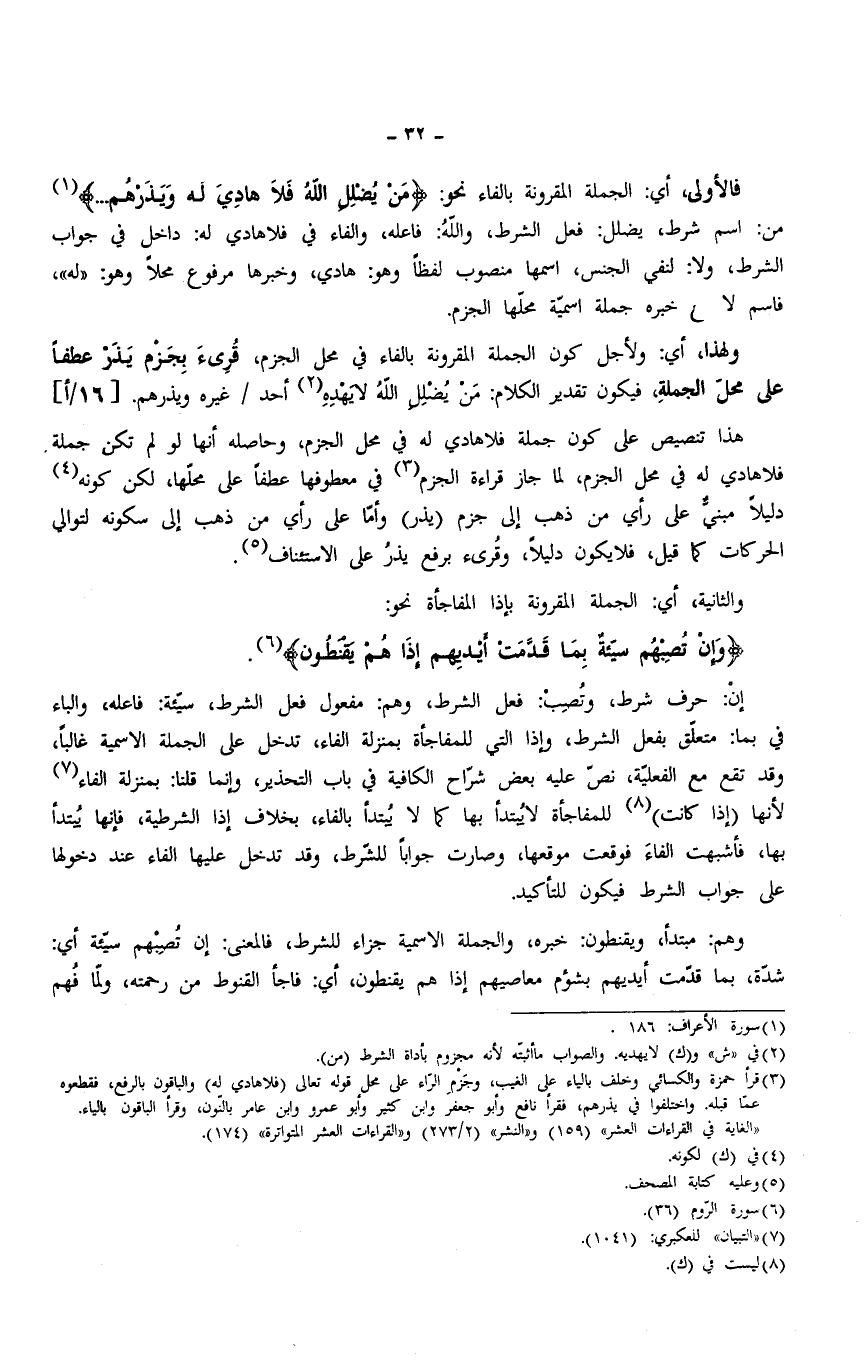 إنْ: حرف شرط، وتُصِبُ: فعل الشرط، وهم: مفعول فعل الشرط، سيّئة: فاعله، والباء في بما: متعلّق بفعل الشرط، وإذا التي للمفاجأة بمنزلة الفاء، تدخل على الجملة الاسمية غالبًا، وقد تقع مع الفعليّة، نصّ عليه بعض شرّاح الكافية في باب التحذير، وإنما قلنا: بمنزلة الفاء لأنها (إذا كانت) للمفاجأة لا يُبتدأ بها كما لا يُبتدأ بالفاء، بخلاف إذا الشرطية، فإنها يُبتدأ بها، فأشبهت الفاءَ فوقعت موقعها، وصارت جوابًا للشّرط، وقد تدخل عليها الفاء عند دخولها على جواب الشرط فيكون للتأكيد.