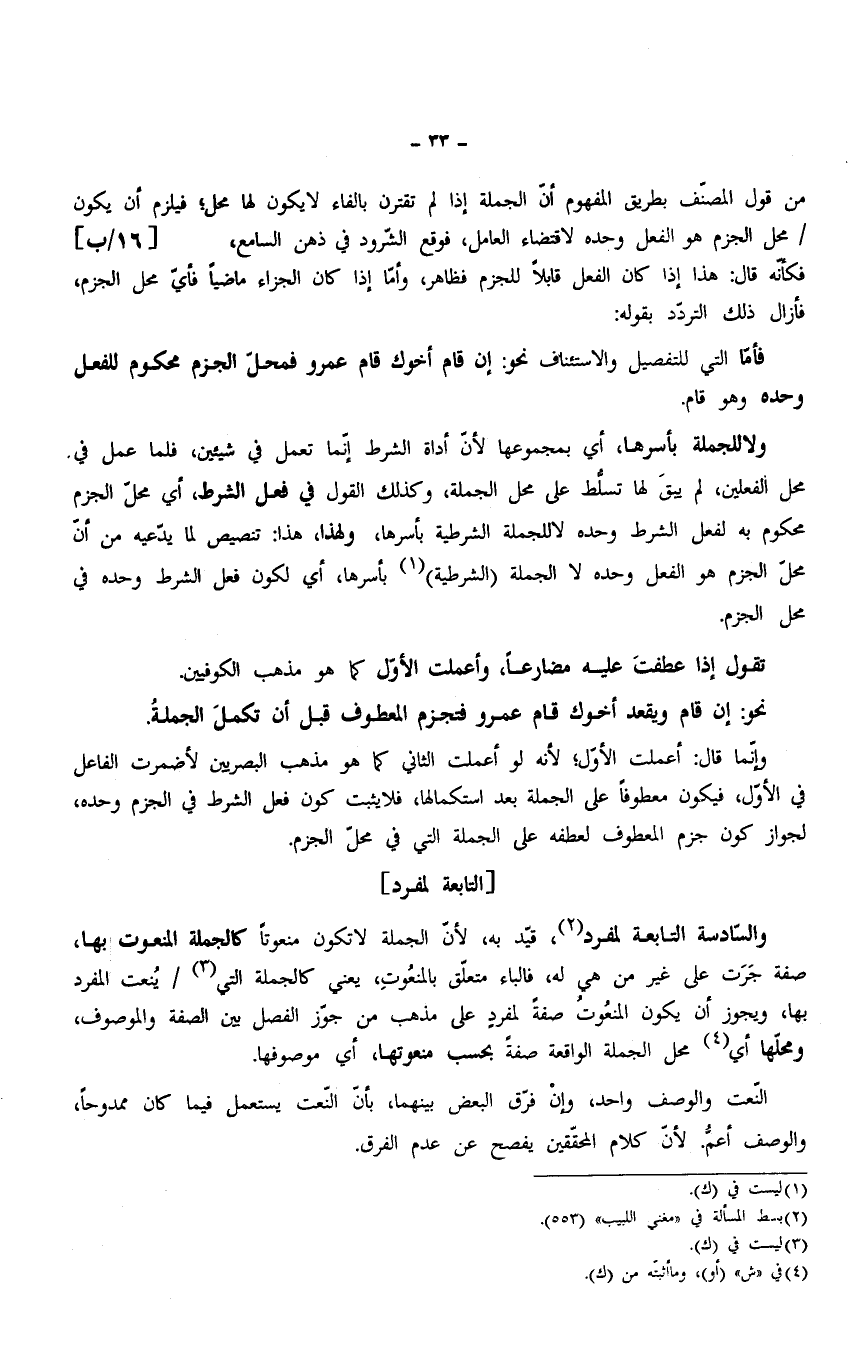 والسّادسة التابعة لمفرد، قيّد به، لأنّ الجملة لا تكون منعوتًا كالجملة المنعوت بها، صفة جَرَت على غير من هي له، فالباء متعلّق بالمنعُوتِ، يعني كالجملة التي يُنعت المفرد بها، ويجوز أن يكون المنعُوتُ صفة لمفردٍ على مذهب من جوّز الفصل ببن الصفة والموصوف، ومحلّها أي محل الجملة الواقعة صفة بحسب منعوتها، أي موصوفها.