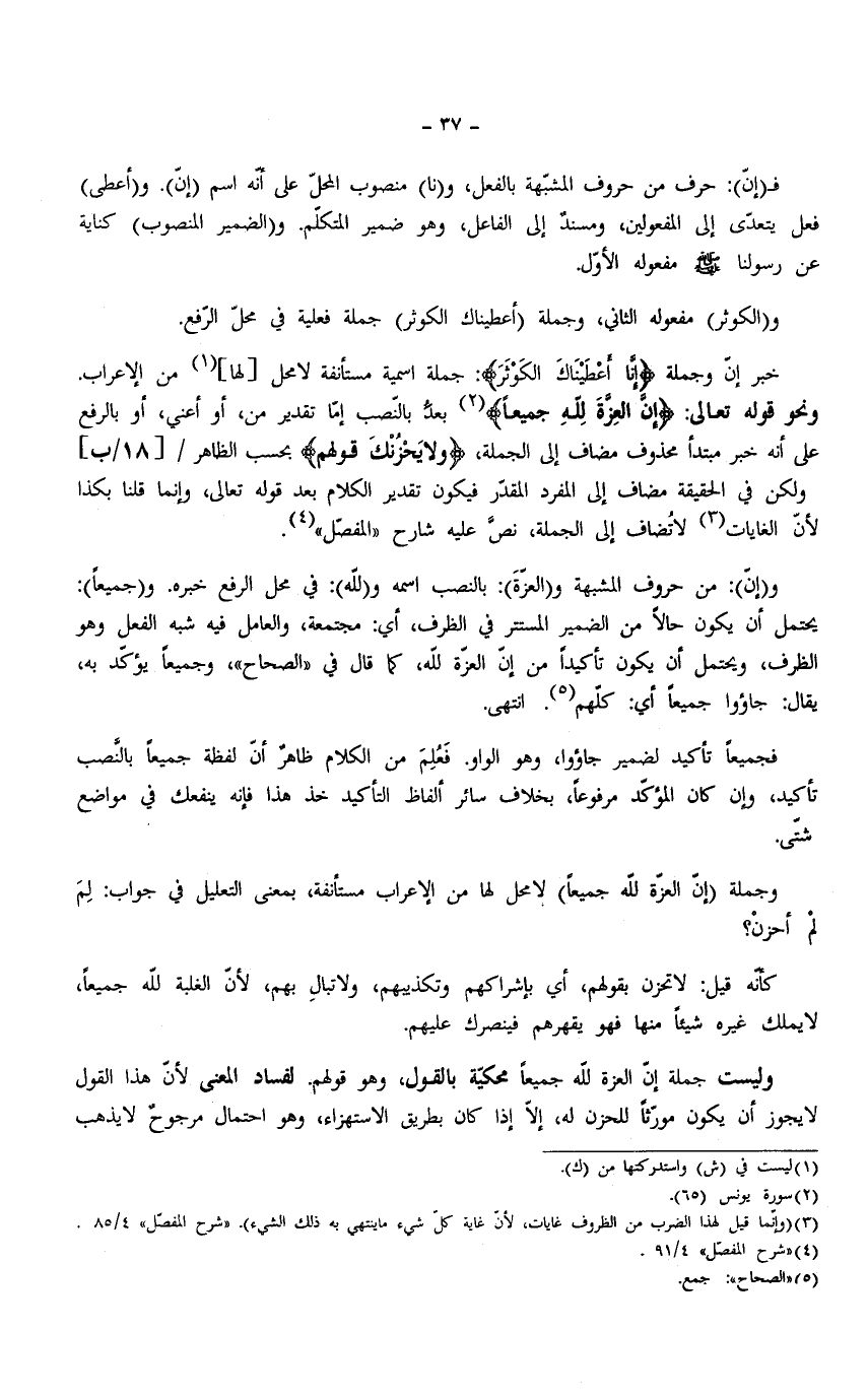 خبر إنّ وجملة {إِنَّا أَعْطَيْنَاكَ الْكَوْثَرَ}: جملة اسمية مستأنفة لا محل [لها] من الإعراب. ونحو قوله تعالى: {إِنَّ الْعِزَّةَ لِلَّهِ جَمِيعًا} بعدّ بالنّصب إمّا تقدير من، أو أعني، أو بالرفع على أنه خبر مبتدأ محذوف مضاف إلى الجملة، {وَلَا يَحْزُنْكَ قَوْلُهُمْ} بحسب الظاهر ولكن في الحقيقة مضاف إلى المفرد المقدّر فيكون تقدير الكلام بعد قوله تعالى، وإنما قلنا بكذا لأنّ الغايات لا تُضاف إلى الجملة، نصَّ عليه شارح "المفصّل".