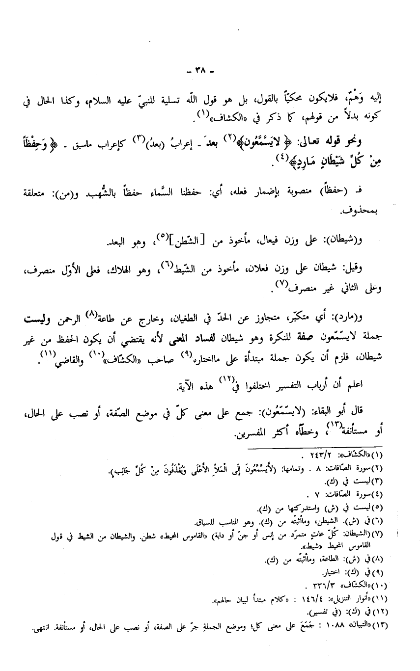 و (مارد): أي متكبّر، متجاوز عن الحدّ في الطغيان، وخارج عن طاعة الرحمن وليست جملة لا يسّمّعون صفة للنكرة وهو شيطان لفساد المعنى لأنه يقتضي أن يكون الحفظ من غير شيطان، فلزم أن يكون جملة مبتدأة على ما اختاره صاحب "الكشّاف" والقاضي.