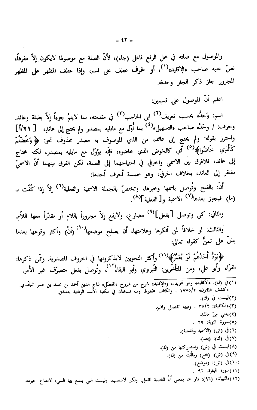 اسم: وَحدُّه بحسب تعريف ابن الحاجب في مقدمته، بما لا يتمُ جزءًا إلَّا بصلة وعائد. وحرف: وحَدَّه صاحب "التسهيل" بما أُوّل مع ما يليه بمصدر ولم يحتج إلى عائدٍ، واحترز بقوله: ولم يحتج إلى عائد، من الَّذي الموصوف به مصدر محذوف نحو: {وَخُضْتُمْ كَالَّذِي خَاضُوا} أي كالخوض الَّذي خاضوه، فإنّه يؤوّل مع ما يليه بمصدر، لكنه محتاج إلى عائد، فلا فرق بين الاسمي والحرفي في احتياجهما إلى الصلة، لكن الفرق بينهما أنّ الاسميّ مفتقر إلى العائد، بخلاف الحرفيّ، وهو خمسة أحرف أحدها: