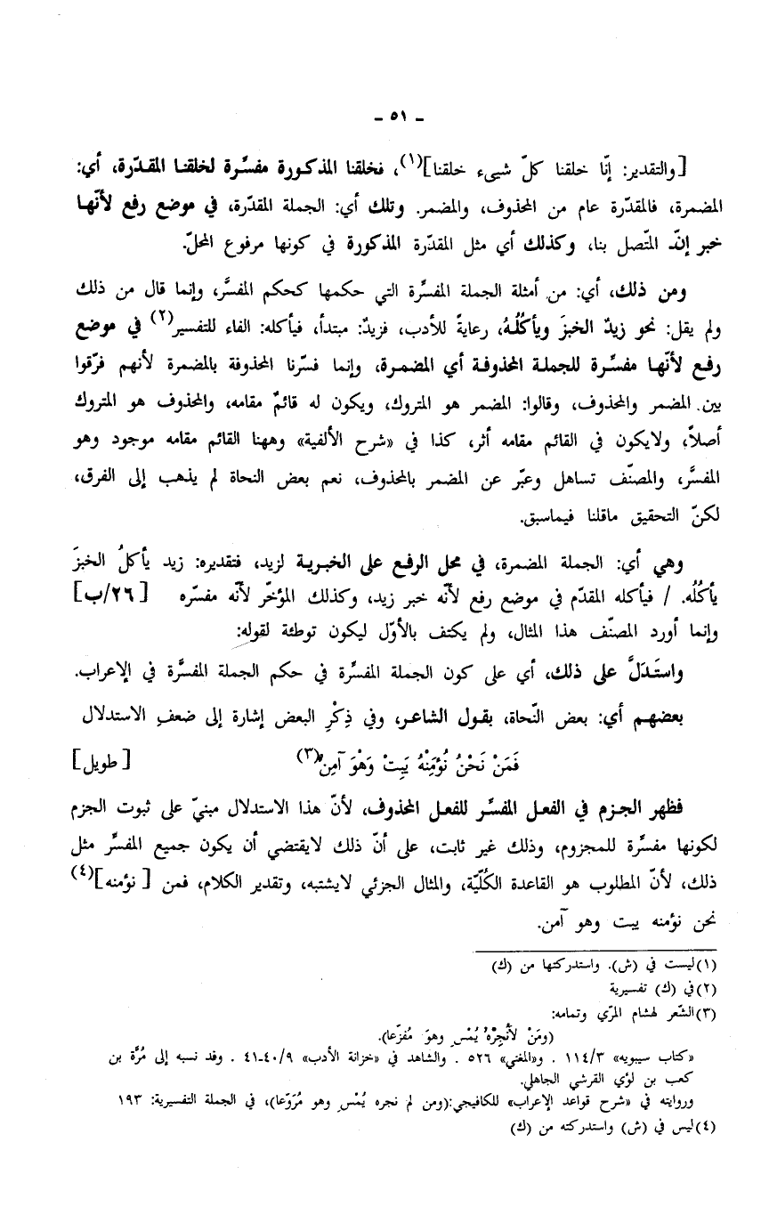 فظهر الجزم في الفعل المفسِّر للفعل المحذوف، لأنّ هذا الاستدلال مبنيّ على ثبوت الجزم لكونها مفسِّرة للمجزوم، وذلك غير ثابت، على أن ذلك لا يقتضي أن يكون جميع المفسِّر مثل ذلك، لأنّ المطلوب هو القاعدة الكُلّيّة، والمثال الجزئى لا يشتبه، وتقدير الكلام، فمن [نؤمنه] نحن نؤمنه يبت وهو آمن.