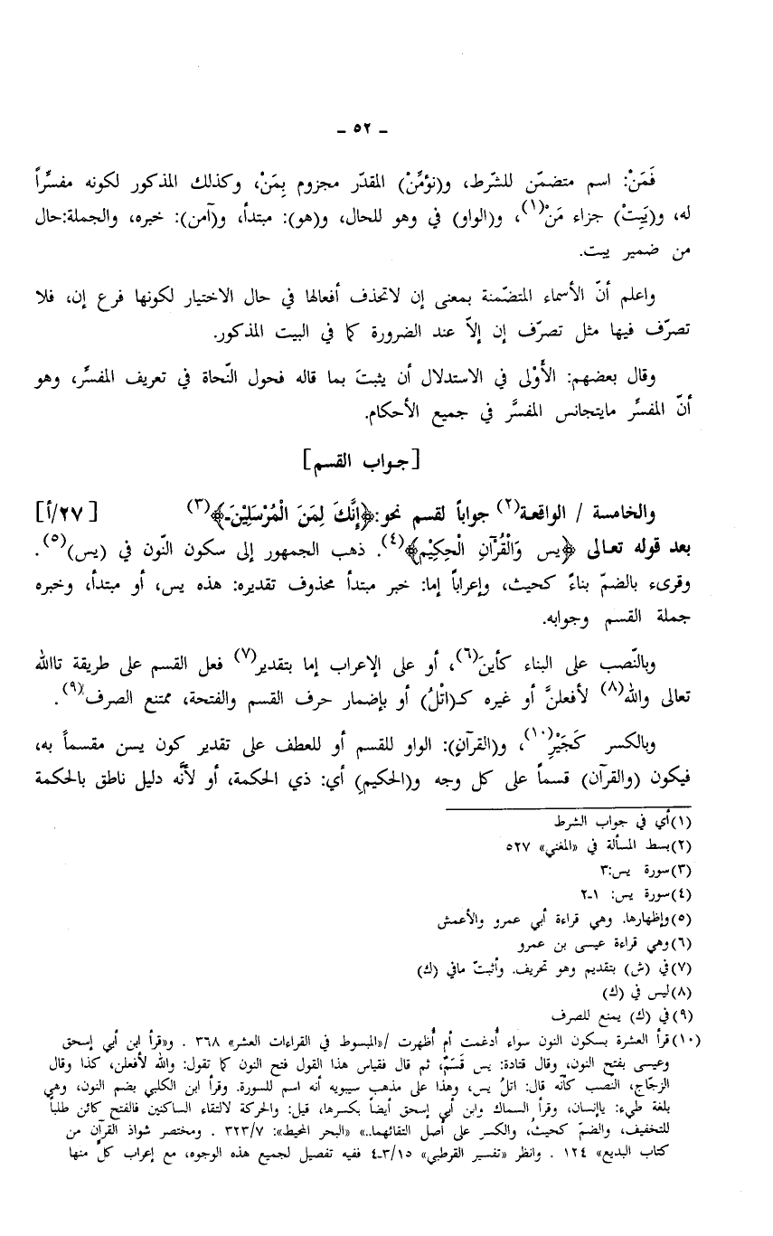 والخامسة الواقعة جوابًا لقسم نحو: {إِنَّكَ لَمِنَ الْمُرْسَلِينَ} بعد قوله تعالى {يس وَالْقُرْآنِ الْحَكِيمِ}. ذهب الجمهور إلى سكون النّون في (يس). وقرئ بالضمّ بناءً كحيث، وإعرابًا إما: خبر مبتدأ محذوف تقديره: هذه يس، أو مبتدأ، وخبره جملة القسم وجوابه.