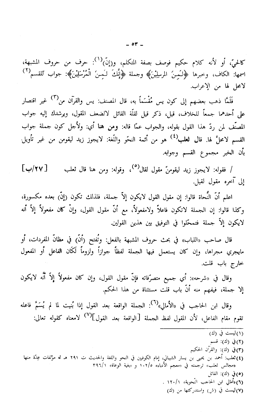 فَلَمَّا ذهب بعضهم إلى كون يس مُقْسَمًا به، قال المصنف: يس والقرآن من غير اقتصار على أحدهما جمعًا للخلاف، قيل، ذكر قيل لقلّة القائل لا لضعف المقول، ويرشدك إليه جواب المصنّف لمن ردّ هذا القول بقوله، والجواب عمّا قاله: ومن هنا أي: ولأجل كون جملة جواب القسم لا محلَّ لها. قال ثعلب هو من أئمة النحو واللّغة: لا يجوز زيد ليقومن من غير تأويل بأن الخبر مجموع القسم وجوابه.