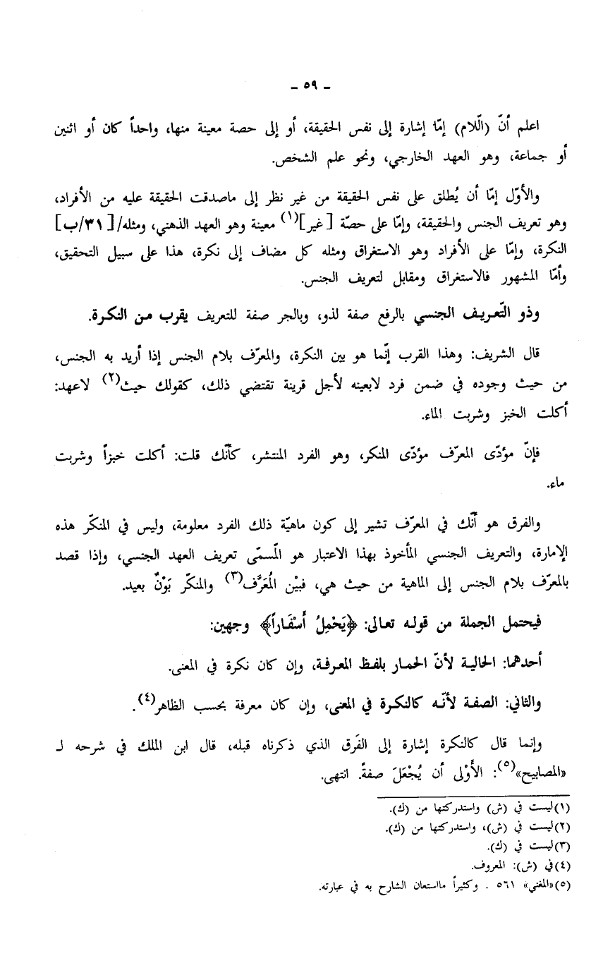 اعلم أنّ (الّلام) إمّا إشارة إلى نفس الحقيقة، أو إلى حصة معينة منها، واحدًا كان أو اثنين أو جماعة، وهو العهد الخارجي، ونحو علم الشخص.