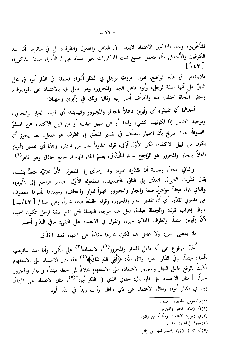 المتأخرين، وعند المتقدمين الاعتماد لا يجب في الفاعل والمفعول والظرف، بل في سائرها. أمّا عند الكوفيين والأخفش منّا، فتعمل جميع تلك المذكورات بغير اعتماد على الأشياء الستة المذكورة، فلا يختص في هذه المواضع. تقول: مررت برجل في الدّار أبُوه، فجملة: في الدّار أبوه في محل الجرّ على أنها صفة لرجل، وأبوه فاعل الجار والمجرور، وهو يعمل فيه بالاعتماد على الموصوف. وبعض النُّحاة اختلف فيه والمصنِّف أشار إليه وقال: ولك في (أبوه) وجهان: