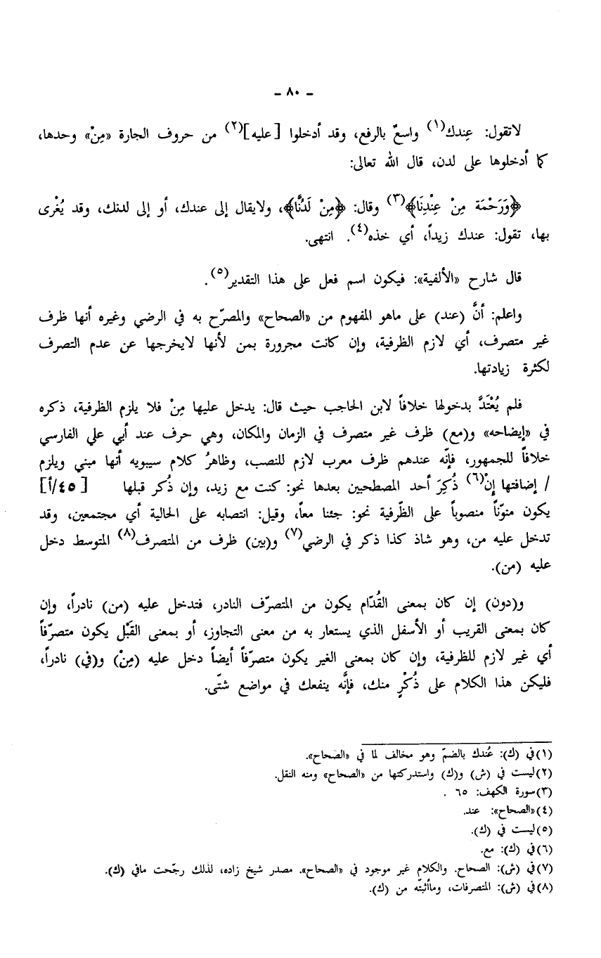 واعلم: أنَّ (عند) على ما هو المفهوم من "الصحاح" والمصرّح به في الرضي وغيره أنها ظرف غير متصرف، أي لازم الظرفية، وإن كانت مجرورة بمن لأنها لا يخرجها عن عدم التصرف لكثرة زيادتها.