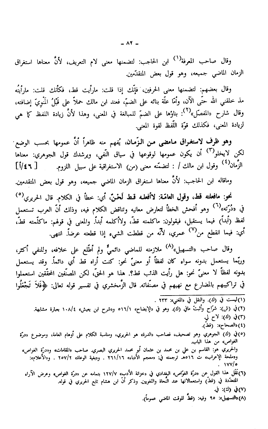 نحو: ما فعلته قط، وقول العامّة: لا أفعله قط لَحْنٌ، أي: خطأ في الكلام. قال الحريري في "دُرّته" وهو أفحش الخطأ لتعارض معانيه وتناقض الكلام فيه، وذلك أنّ العرب تستعمل لفظ (أبدًا) فيما يستقبل، فيقولون: ما كلمته قطّ، ولا أكلمه أبدًا. والمعنى في قولهم: ما كلّمته قط، أي: فيما انقطع من عمري، لأنّه من قططت الشيء إذا قطعته عرضًا. انتهى.
