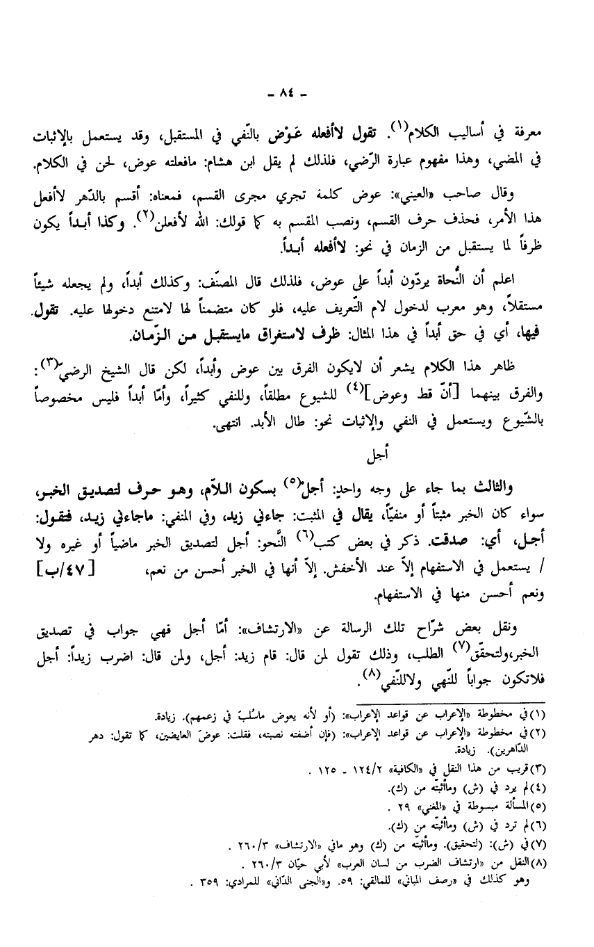 معرفة في أساليب الكلام. تقول لا أفعله عَوْض بالنّفي في المستقبل، وقد يستعمل بالإثبات في المضي، وهذا مفهوم عبارة الرّضي، فلذلك لم يقل ابن هشام: ما فعلته عوض، لحن في الكلام.