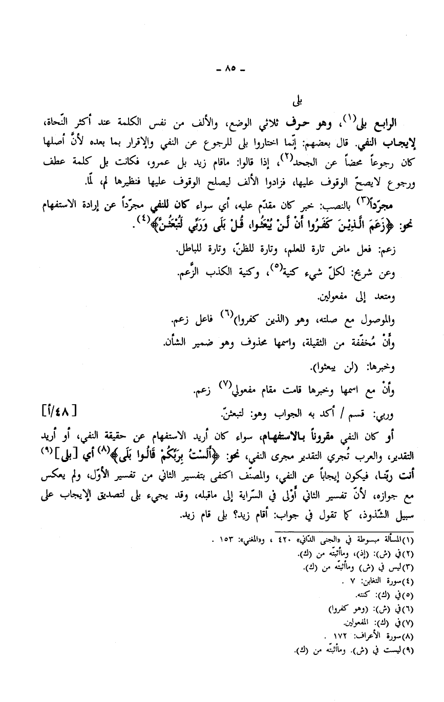 الرابع بلى، وهو حرف ثلاثي الوضع، والألف من نفس الكلمة عند أكثر النّحاة، لإيجاب النفي. قال بعضهم: إنما اختاروا بلى للرجوع عن النفي والإقرار بما بعده لأنَّ أصلها كان رجوعًا محضًا عن الجحد، إذا قالوا: ما قام زيد بل عمرو، فكانت بل كلمة عطف ورجوع لا يصحّ الوقوف عليها، فزادوا الألف ليصلح الوقوف عليها فنظيرها لم، لمّا.