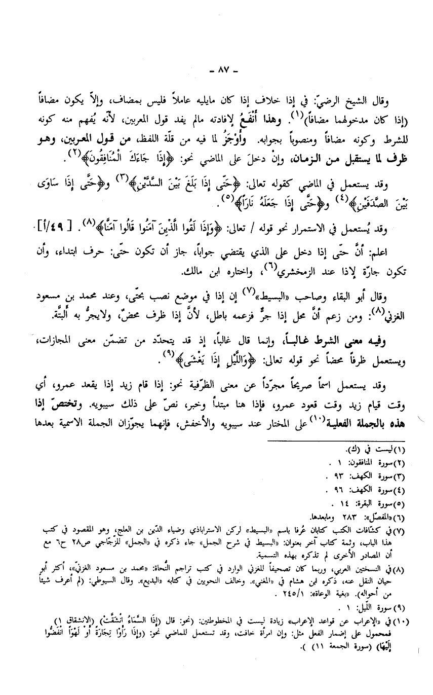 وقال الشيخ الرضيّ: في إذا خلاف إذا كان ما يليه عاملًا فليس بمضاف، وإلّا يكون مضافًا (إذا كان مدخولهما مضافًا). وهذا أنْفَع لإفادته ما لم يفد قول المعربين، لأنّه يُفهم منه كونه للشرط وكونه مضافًا ومنصوبًا بجوابه. وأَوْجَزُ لما فيه من قلّة اللفظ، من قول المعربين، وهو ظرف لما يستقبل من الزمان، وإنْ دخلَ على الماضى نحو: {إِذَا جَاءَكَ الْمُنَافِقُونَ}.