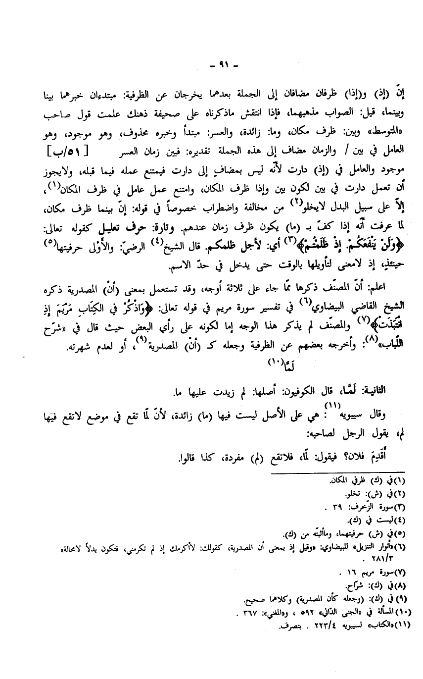 إن (إذ) و (إذا) ظرفان مضافان إلى الجملة بعدهما يخرجان عن الظرفية: مبتدءان خبرهما بينا وبينما، قيل: الصواب مذهبهما، فإذا انتقش ما ذكرناه على صحيفة ذهنك علمت قول صاحب "المتوسط" وبين: ظرف مكان، وما: زائدة، والعسر: مبتدأ وخبره محذوف، وهو موجود، وهو العامل في بين والزمان مضاف إلى هذه الجملة تقديره: فبين زمان العسر موجود والعامل في (إذ) دارت لأنه ليس بمضافٍ إلى دارت فيمتنع عمله فيما قبله، ولا يجوز أن تعمل دارت في بين لكون بين وإذا ظرف المكان، وامتنع عمل عامل في ظرف المكان، إلَّا على سبيل البدل لا يخلو من مخالفة واضطراب خصوصًا في قوله: إن بينما ظرف مكان، لما عرفت أنه إذا كفّ بـ (ما) يكون ظرف زمان عندهم. وتارة: حرف تعليل كقوله تعالى: {وَلَنْ يَنْفَعَكُمُ الْيَوْمَ إِذْ ظَلَمْتُمْ} أي: لأجل ظلمكم. قال الشيخ الرضي: والأَوْلى حرفيتها حينئذ، إذ لا معنى لتأويلها بالوقت حتى يدخل في حد الاسم.