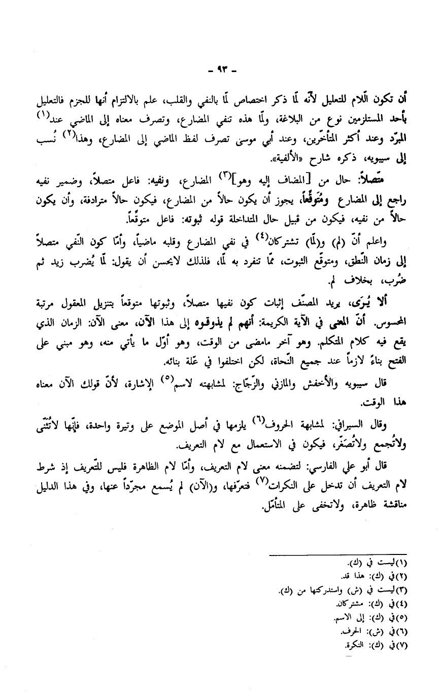 وقال السيرافي: لمشابهة الحروف يلزمها في أصل الموضع على وتيرة واحدة، فإنها لا تُثنّى ولا تُجمع ولا تُصَغر، فيكون في الاستعمال مع لام التعريف.