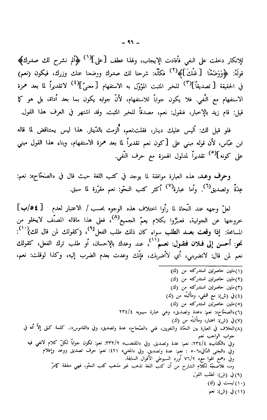 للإنكار دخلت على النفي فأفادت الإيجاب، ولهذا عطف [على] {أَلَمْ نَشْرَحْ لَكَ صَدْرَكَ} قولَهُ: {وَوَضَعْنَا [عَنْكَ]} فكأنه: شرحنا لك صدرك ووضعنا عنك وزرك، فيكون (نعم) في الحقيقة [تصديقًا] للخبر المثبت المؤول به الاستفهام [معنىً] لا تقديرًا لما بعد همزة الاستفهام مع النفي. فلا يكون جوابًا للاستفهام، لأن جوابه يكون بما بعد أداة، بل هو كما قيل: قام زيد بالإخبار، فنقول: نعم، مصدقًا للخبر المثبت. وقد اشتهر في العرف هذا القول.