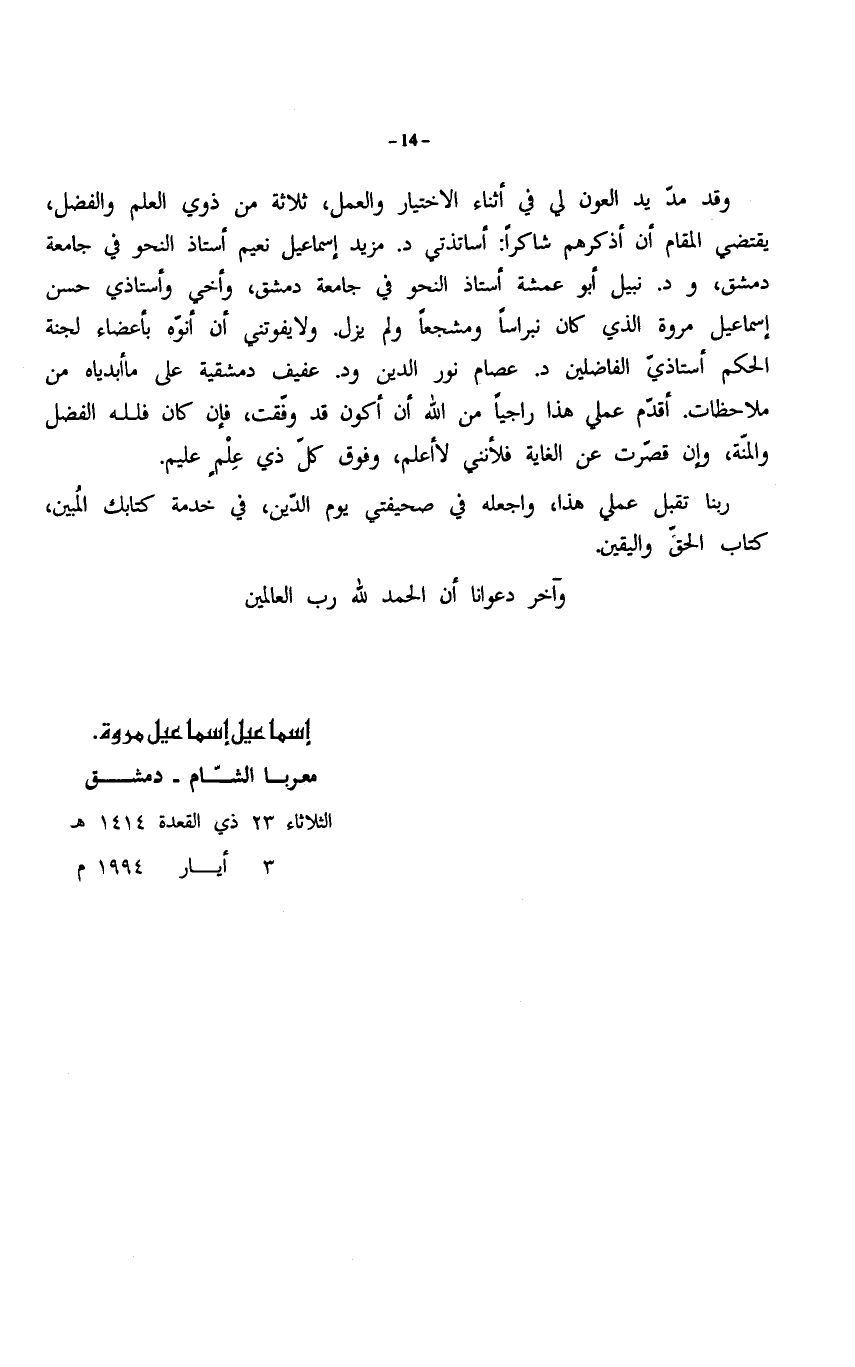 وقد مدّ يد العون لي في أثناء الإختيار والعمل، ثلاثة من ذوي العلم والفضل، يقتضي المقام أن أذكرهم شاكرًا: أساتذتي د. مزيد إسماعيل نعيم أستاذ النحو في جامعة دمشق، ود. نبيل أبو عمشة أستاذ النحو في جامعة دمشق، وأخي وأستاذي حسن إسماعيل مروة الذي كان نبراسًا ومشجعًا ولم يزل. ولا يفوتني أن أنوّه بأعضاء لجنة الحكم أستاذيّ الفاضلين د. عصام نور الدين ود. عفيف دمشقية على ما أبدياه من ملاحظات. أقدّم عملي هذا راجيًا من الله أن أكون قد وفّقت، فإن كان فلله الفضل والمنة، وإن قصّرت عن الغاية فلأنني لا أعلم، وفوق كلّ ذي عِلْمٍ عليم.