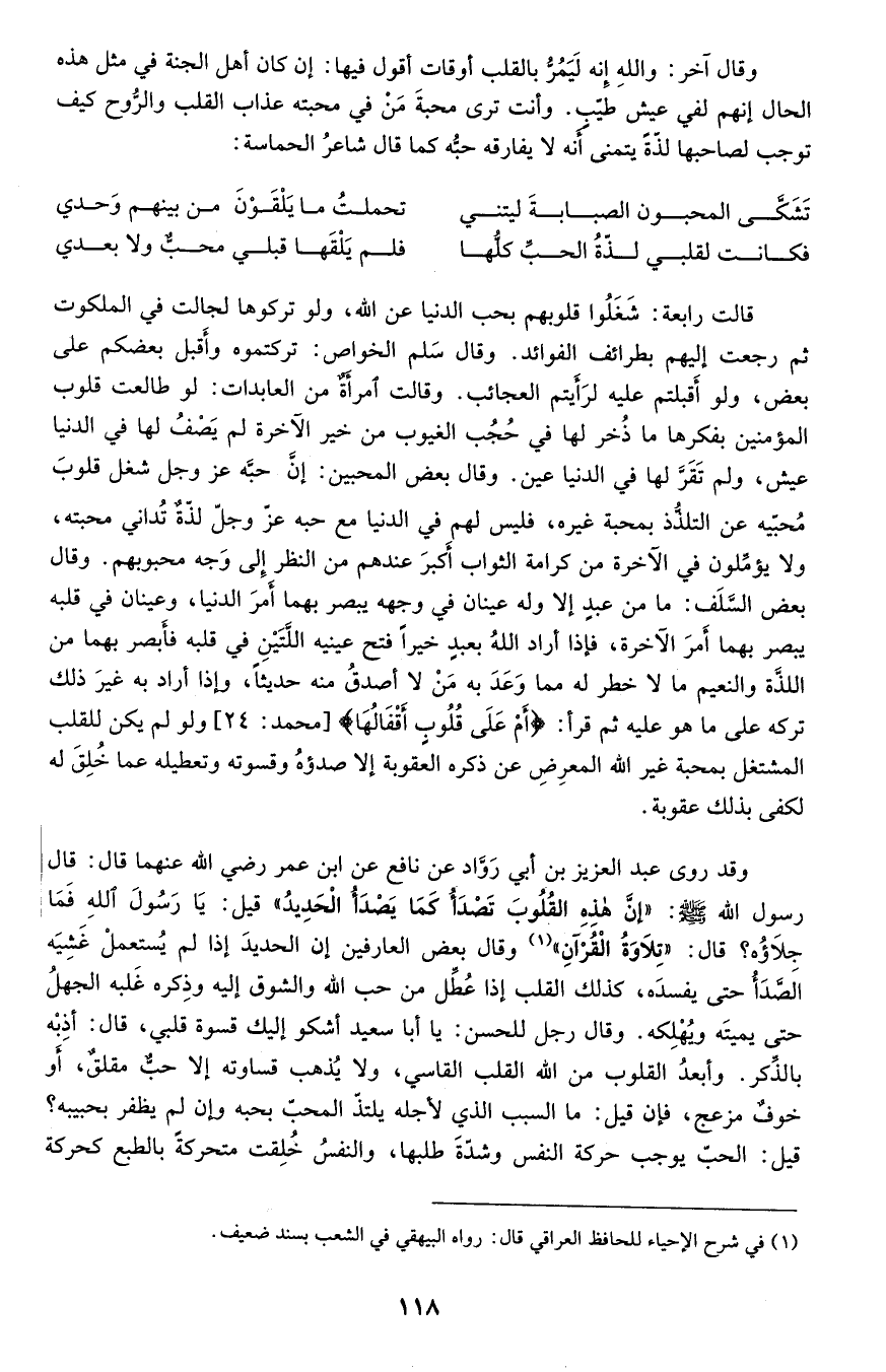 أبو عبد الله إبراهيم بن محمد بن عرفة نفطويه بقرطبة قال دخلت على محمد بن داود الأصبهاني في مرضه الذي مات فيه فقلت له كيف تجدك قال حب من تعلم أورثني ما ترى فقلت له ما منعك عن الاستمتاع به مع القدرة عليه قال الاستمتاع على وجهين أحدهما النظر المباح والثاني اللذة المحظورة فأما النظر المباح فأورثني ما ترى وذكر القصة وستأتي في باب عفاف العشاق والمقصود أنه لم ير النظر إلى معشوقه ولا عشقه حراما وجرى على هذا المذهب أبو محمد بن حزم في كتاب طوق الحمامة له قالوا ونحن نحاكمكم إلى واحد يعد بآلاف مؤلفة وهو شيخ الإسلام ابن تيمية فإنه سئل