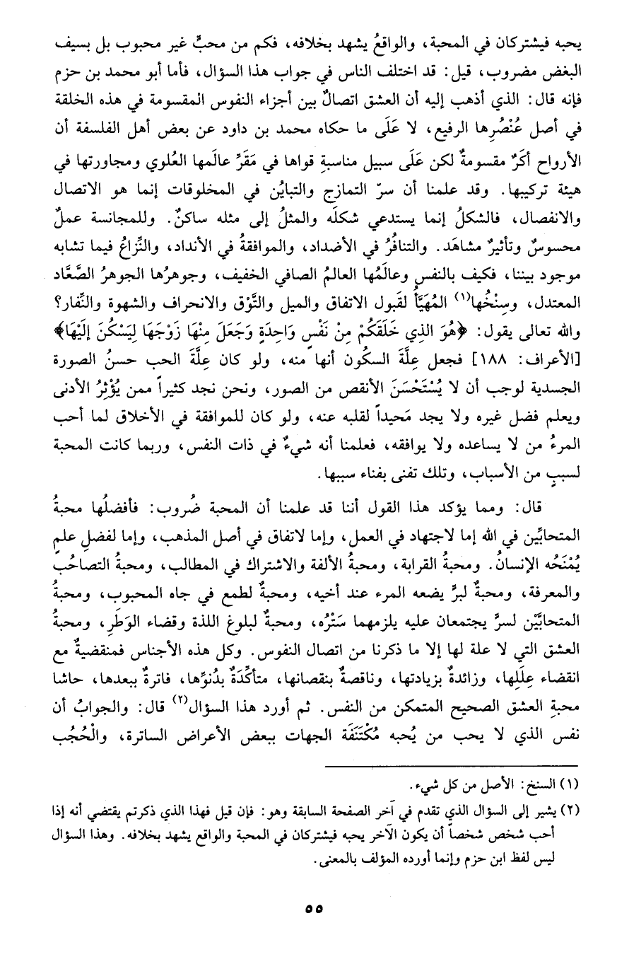 وهذا باب شريف من أشرف أبواب الكتاب وقبل تقريره لا بد من بيان مقدمة وهي أن الحركات ثلاث حركة إرادية وحركة طبيعية وحركة قسرية وبيان الحصر أن مبدأ الحركة إما أن يكون من المتحرك أو من غيره فإن كان من المتحرك فإما أن يقارنها شعوره وعلمه بها أولا فإن قارنها الشعور والعلم فهي الإرادية وإن لم يقارنها الشعور والعلم فهي الطبيعية وإن كانت من غيره فهي القسرية وإن شئت أن تقول المتحرك إما أن يتحرك بإرادته أو لا فإن تحرك بإرادته فحركته إرادية وإن تحرك بغير إرادته فإما أن تكون حركته إلى نحو مركزه أولا فإن تحرك إلى جهة مركزه فحركته طبيعية وإن تحرك إلى غير جهة مركزه فحركته قسرية إذا ثبت هذا فالحركة الإرادية تابعة لإرادة المتحرك والمراد إما أن يكون مرادا لنفسه أو لغيره ولا بد أن ينتهي المراد لغيره إلى مراد لنفسه دفعا للدور والتسلسل الإرادة إما أن تكون لجلب منفعة ولذة إما للمتحرك وإما لغيره أو دفع ألم ومضرة إما عن المتحرك أو عن غيره والعاقل لا يجلب لغيره منفعة ولا يدفع عنه مضرة إلا لما له في ذلك من اللذة ودفع الألم فصارت حركته الإرادية تابعة لمحبته بل هذا حكم كل حي متحرك وأما الحركة الطبيعية فهي حركة الشيء إلى مستقره ومركزه وتلك تابعة للحركة التي اقتضت خروجه عن مركزه وهي القسرية التي إنما تكون بقسر قاسر أخرجه عن مركزه إما باختياره كحركة الحجر إلى اسفل إذا رمى به