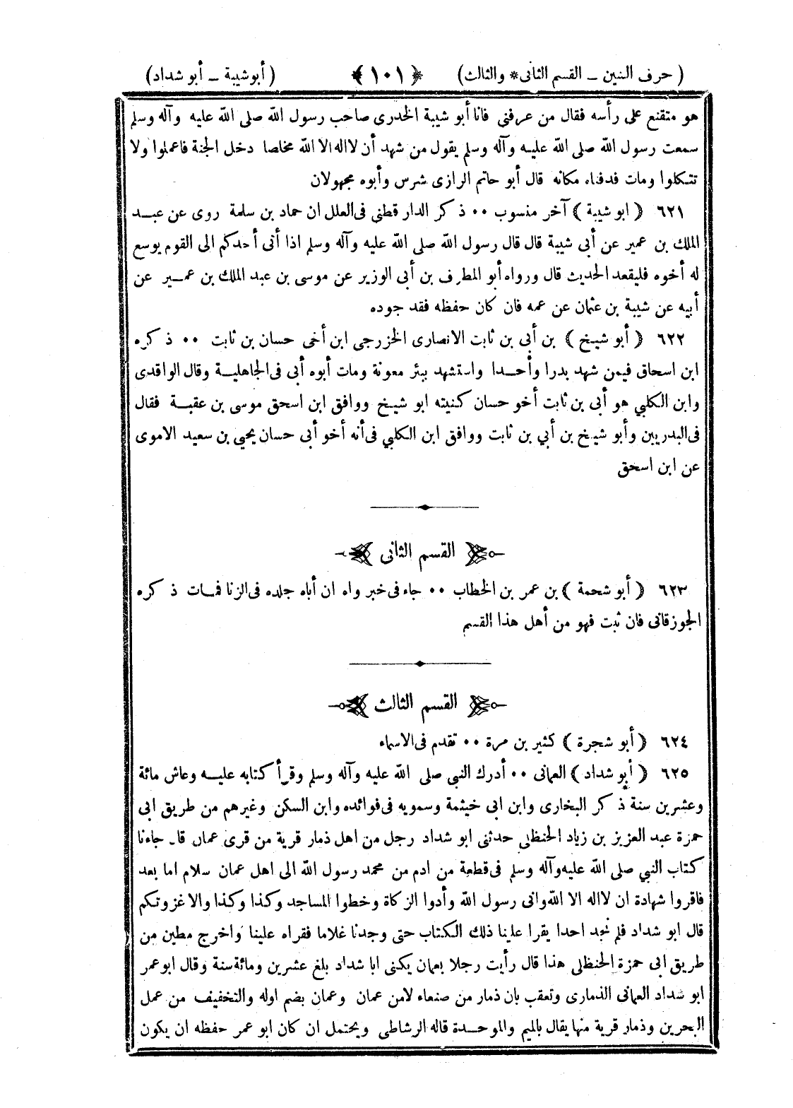 <101> هو مقنع على رأسه فقال من عرفني فأنا أبو شيبة الخدري صاحب رسول الله صلى الله عليه وسلم سمعت رسول الله صلى الله عليه وسلم يقول من شهد أن لا إله إلا الله مخلصا دخل الجنة فاعملوا ولا تتكلوا ومات فدفناه مكانه قال أبو حاتم الرازي شرس وأبوه مجهولان أبو شيبة آخر غير منسوب ذكر الدارقطني في العلل أن حماد بن سلمة روى عن عبد الملك بن عمير عن أبي شيبة قال قال رسول الله صلى الله عليه وسلم إذا أتى أحدكم إلى القوم يوسع له أخوه فليقعد الحديث وفيه ثلاث تصفين لك ود أخيك قال ورواه أبو المطرف بن أبي الوزير عن موسى بن عبد الملك بن عمير عن أبيه عن شيبة بن عثمان عن عمه فإنه كان حفظه فقد جوده أبو شيخ بن أبي ثابت الأنصاري الخزرجي بن أخي حسان بن ثابت ذكره بن إسحاق فيمن شهد بدرا وأحدا واستشهد ببئر معونة ومات أبوه أبي في الجاهلية وقال الواقدي وابن الكلبي هو أبي بن ثابت أخو حسان كنيته أبو شيخ ووافق بن إسحاق موسى بن عقبة فقال في البدريين وأبو شيخ بن أبي بن ثابت ووافق بن الكلبي في أنه أخو أبي حسان يحيى بن سعيد الأموي عن بن إسحاق القسم الثاني أبو شحمة بن عمر بن الخطاب جاء في خبر واه أن أباه جلده في الزنا فمات ذكره الجوذقاني فإن ثبت فهو من أهل هذا القسم القسم الثالث أبو شجرة كثير بن مرة تقدم في الأسماء أبو شداد العماني أدرك النبي صلى الله عليه وسلم وقرأ كتابه عليه وعاش مائة وعشرين سنة ذكر البخاري وابن أبي خيثمة وسمويه في فوائده وابن السكن وغيرهم من طريق أبي حمزة عبد العزيز بن زياد الحنظلي حدثني أبو شداد رجل من أهل ذمار قرية من قرى عمان قال جاءنا كتاب النبي صلى الله عليه وسلم في قطعة من أدم من محمد رسول الله إلى أهل عمان سلام أما بعد فأقروا بشهادة أن لا إله إلا الله وأني رسول الله وأدوا الزكاة وخطوا المساجد وكذا وكذا وإلا غزوتكم قال أبو شداد فلم نجد أحدا يقرأ علينا ذلك الكتاب حتى وجدنا غلاما فقرأ علينا قلت فمن كان يومئذ على عمان قال أسوار من أساورة كسرى وأخرج مطين من طريق أبي حمزة الحنظلي هذا قال رأيت رجلا بعمان يكنى أبا شداد بلغ عشرين ومائة سنة وقال أبو عمر أبو شداد العماني الذماري وتعقب بأن ذمار من صنعاء لا من عمان وعمان بضم أوله والتخفيف من عمل البحرين وذمار قرية منها يقال بالميم والموحدة قاله الرشاطي ويحتمل إن كان أبو عمر حفظه أن يكون §