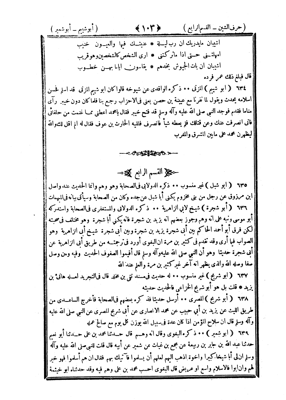<103> أشيبان ما يدريك أن رب ليلة غبقتك فيها والغبوق حبيب أأمهلتني حتى إذا ما تركتني أرى الشخص كالشخصين وهو قريب أشيبان إن تأت الجيوش تجدهم يقاسون أياما بهن خطوب قال فبلغ ذلك عمر فرده أبو شييم المري ذكره الواقدي عن شيوخه قالوا كان أبو شييم المزني قد أسلم فحسن إسلامه يحدث ويقول لما نفرنا مع عيينة بن حصن يعني في الأحزاب رجع بنا فلما كان دون خيبر رأى مناما فقدم فوجد النبي صلى الله عليه وسلم قد فتح خيبر فقال يا محمد أعطني مما غنمت من حلفائي فإني انصرفت عنك وعن قتالك فلم يعطه شيئا فانصرف فلقيه الحارث بن عوف فقال له ألم أقل لك والله ليظهرن محمد على ما بين المشرق والمغرب القسم الرابع أبو شبل غير منسوب ذكره الدولابي في الصحابة وهو وهم وإنما الحديث عند واصل بن مروزق عن رجل من بني مخزوم يكنى أبا شبل عن جده وكان من الصحابة وسيأتي بيانه في المبهمات أبو شجرة شيخ لأبي الزاهرية ذكره الدولابي والمستغفري في الصحابة واستدركه أبو سي ونبه على أنه وهم وجوز بعضهم أنه يزيد بن شجرة فإنه يكنى أبا شجرة وهو مختلف في صحبته لكن فرق أبو أحمد الحاكم بين أبي شجرة يزيد بن شجرة وبين أبي شجرة شيخ أبي الزاهرية وهو الصواب فيما أرى وقد تقدم في كثير بن مرة أن البغوي أورد في ترجمة من طريق أبي الزاهرية عن أبي شجرة حديثا وهو أن النبي صلى الله عليه وسلم قال أقيموا الصفوف الحديث وفيه ومن وصل صفا وصله الله والذي يظهر أنه آخر غير كثير بن مرة والعلم عند الله أبو شريح غير منسوب له حديث في مسند بقي بن مخلد قال في التجريد لعله هانئ بن يزيد قلت بل هو أبو شريح الخزاعي فالحديث حديثه أبو شريح المصري أرسل حديثا فذكره بعضهم في الصحابة فأخرج الساعدي من طريق الليث عن يزيد بن أبي حبيب عن محمد الأنصاري عن أبي شريح المصري عن النبي صلى الله عليه وسلم قال إن سلام المؤمن إذا كان عدة في سبيل الله يوزن كل يوم مع صالح عمله أبو شمير ذكره البغوي وقال إنه وهم قال حدثنا محمد بن علي حدثنا أبو نعيم حدثنا عبد الله بن جابر بن ربيعة عن مجمع بن عتاب عن أبيه عن شمير قال قلت للنبي صلى الله عليه وسلم إن لي أبا شيخا كبيرا وإخوة أذهب إليهم لعلهم أن يسلموا فآتيك بهم فقال إن هم أسلموا فهو خير لهم وإن أبوا فالإسلام واسع أو عريض قال البغوي أحسب محمد بن علي وهم فيه وقد حدثناه أبو خيثمة §