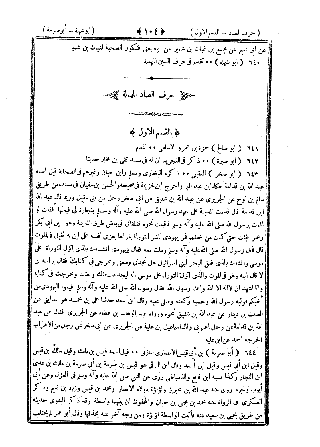 أبو صالح حمزة بن عمر الأسلمي تقدم أبو صبرة ذكر في التجريد أن له في مسند بقي بن مخلد حديثا أبو صخر العقيلي ذكره البخاري ومسلم وابن حبان وغيرهم في الصحابة قيل اسمه عبد الله بن قدامة حكاه بن عبد البر وأخرج بن خزيمة في صحيحه والحسن بن سفيان في مسنده من طريق سالم بن نوح عن الجريري عن عبد الله بن شقيق عن أبي صخر رجل من بني عقيل وربما قال عبد الله بن قدامة قال قدمت المدينة على عهد رسول الله صلى الله عليه وسلم بتجارة لي فبعتها فقلت لو ألممت برسول الله صلى الله عليه وسلم فأقبلت نحوه فتلقاني في بعض طرق المدينة وهو بين أبي بكر وعمر فجئت حتى كنت من خلفهم فمر يهودي ناشر التوراة يقرؤها يعزي نفسه على بن له ثقيل في الموت قال فمال رسول الله صلى الله عليه وسلم وملت معه فقال يا يهودي أنشدك بالذي أنزل التوراة على موسى وأنشدك بالذي فلق البحر لبني إسرائيل فعظم عليه هل تجدني وصفتي ومخرجي في كتابك فقال برأسه أي لا قال فقال ابنه وهو في الموت والذي أنزل التوراة على موسى إنه ليجد صفتك وبعثك ومخرجك في كتابه وأنا أشهد أن لا إله إلا الله وأنك رسول الله فقال رسول الله صلى الله عليه وسلم أقيموا اليهودي عن أخيكم فوليه رسول الله وغسله وكفنه وصلى عليه وقال بن سعد حدثنا علي بن محمد المدائني عن الصلت بن دينار عن عبد الله بن شقيق نحوه ورواه عبد الوهاب بن عطاء عن الجريري فقال عن عبد الله بن قدامة عن رجل أعرابي وقال إسماعيل بن علية عن الجريري عن أبي صخر عن رجل من الأعراب أخرجه أحمد عن بن علية أبو صرمة بن أبي قيس الأنصاري المازني قيل اسمه قيس بن مالك وقيل مالك بن قيس وقيل بن أبي قيس وقيل بن أسعد وقال بن البرقي هو قيس بن صرمة بن أبي صرمة بن مالك بن عدي بن النجار وكذا نسبه بن قانع والدمياطي روى عن النبي صلى الله عليه وسلم في العزل وعن أبي أيوب وغيره روى عنه عبد الله بن محيريز ولؤلؤة مولاة الأنصار ومحمد بن قيس وزياد بن نعيم وذكر العسكري في الرواة عنه محمد بن يحيى بن حبان والمحفوظ أن بينهما واسطة وقد ذكر البغوي حديثه من طريق يحيى بن سعيد عنه فأثبت الواسطة لؤلؤة ومن وجه آخر عنه بحذفها وقال أبو عمر لم يختلف §