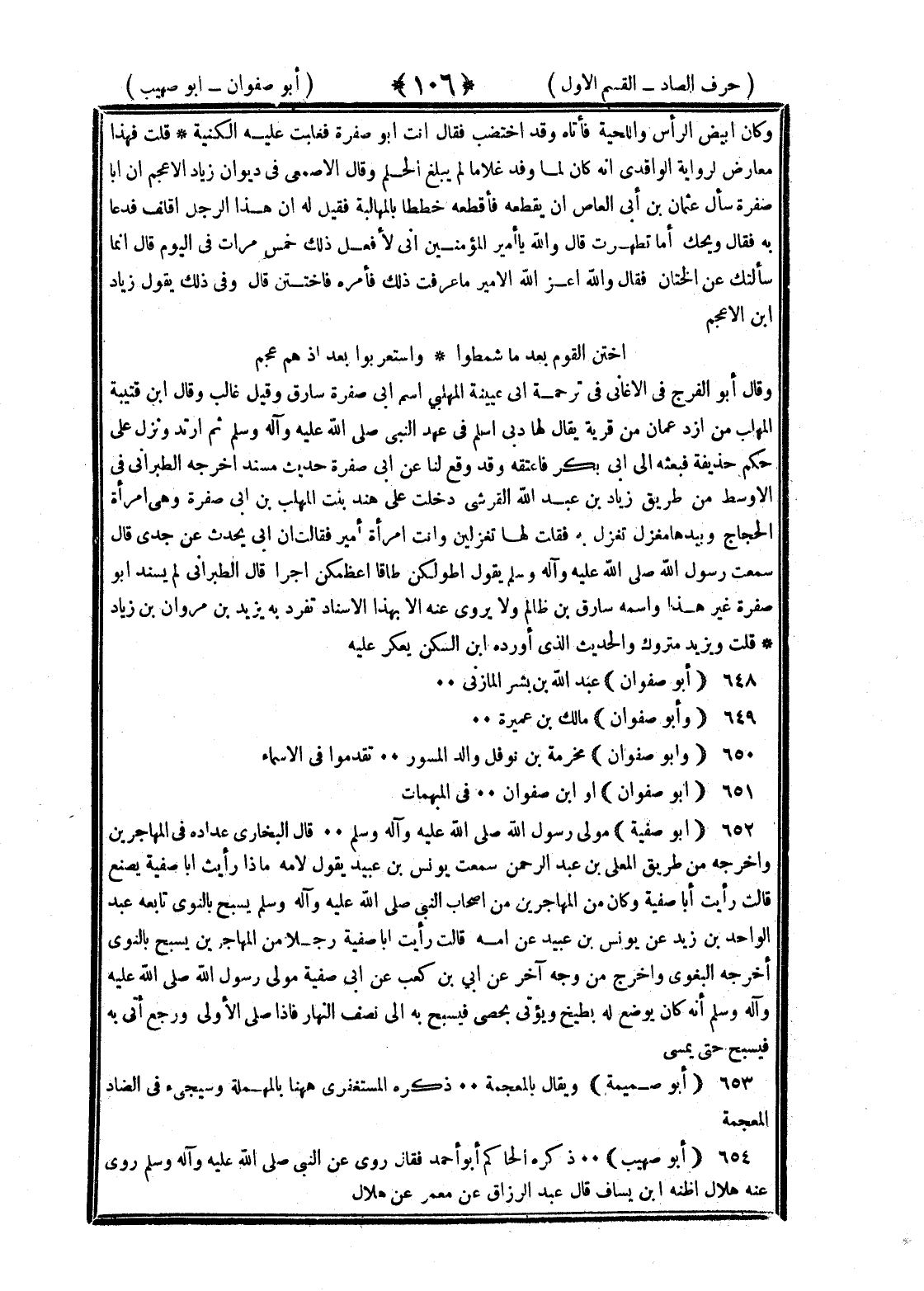 <106> وكان أبيض الرأس واللحية فأتاه وقد اختضب فقال أنت أبو صفرة فغلبت عليه الكنية قلت فهذا معارض لرواية الواقدي أنه كان لما وفد غلاما لم يبلغ الحلم وقال الأصمعي في ديوان زياد الأعجم إن أبا صفرة سأل عثمان بن أبي العاص أن يقطعه فأقطعه خططا بالمهالبة فقيل له إن هذا الرجل أقلف فدعا به فقال ويحك أما تطهرت قال والله يا أمير المؤمنين إني لأفعل ذلك خمس مرات في اليوم قال إنما سألتك عن الختان فقال والله أعز الله الأمير ما عرفت ذلك فأمره فاختتن قال وفي ذلك يقول زياد بن الأعجم اختتن القوم بعد ما شمطوا واستعربوا بعد إذ هم عجم وقال أبو الفرج في الأغاني في ترجمة أبي عيينة المهلبي اسم أبي صفرة سارق وقيل غالب وقال بن قتيبة المهلب من أزد عمان من قرية يقال لها دبا أسلم في عهد النبي صلى الله عليه وسلم ثم ارتد ونزل على حكم حذيفة فبعثه إلى أبي بكر فأعتقه وقد وقع لنا عن أبي صفرة حديث مسند أخرجه الطبراني في الأوسط من طريق زياد بن عبد الله القرشي دخلت على هند بنت المهلب بن أبي صفرة وهي امرأة الحجاج وبيدها مغزل تغزل به فقلت لها تغزلين وأنت امرأة أمير فقالت إن أبي يحدث عن جدي قال سمعت رسول الله صلى الله عليه وسلم يقول أطولكن طاقا أعظمكن أجرا قال الطبراني لم يسند أبو صفرة غير هذا واسمه سارق بن ظالم ولا يروى عنه إلا بهذا الإسناد تفرد به يزيد بن مروان بن زياد قلت ويزيد متروك والحديث الذي أورده بن السكن يعكر عليه أبو صفوان عبد الله بن بشر المازني وأبو صفوان مالك بن عميرة وأبو صفوان مخرمة بن نوفل والد المسور تقدموا في الأسماء أبو صفوان أو بن صفوان في المبهمات أبو صفية مولى رسول الله صلى الله عليه وسلم قال البخاري عداده في المهاجرين وأخرجه من طريق المعلى بن عبد الرحمن سمعت يونس بن عبيد يقول لأمه ماذا رأيت أبا صفية يصنع قالت رأيت أبا صفية وكان من المهاجرين من أصحاب النبي صلى الله عليه وسلم يسبح بالنوى تابعه عبد الواحد بن زيد عن يونس بن عبيد عن أمه قالت رأيت أبا صفية رجلا من المهاجرين يسبح بالنوى أخرجه البغوي وأخرج من وجه آخر عن أبي بن كعب عن أبي صفية مولى رسول الله صلى الله عليه وسلم أنه كان يوضع له نطع ويؤتى بحصى فيسبح به إلى نصف النهار فإذا صلى الأولى ورجع أتى به فيسبح حتى يمسي أبو صميمة ويقال بالمعجمة ذكره المستغفري ههنا بالمهملة وسيجيء في الضاد المعجمة أبو صهيب ذكره الحاكم أبو أحمد فقال روى عن النبي صلى الله عليه وسلم روى عنه هلال أظنه بن يساف قال عبد الرزاق عن معمر عن هلال §