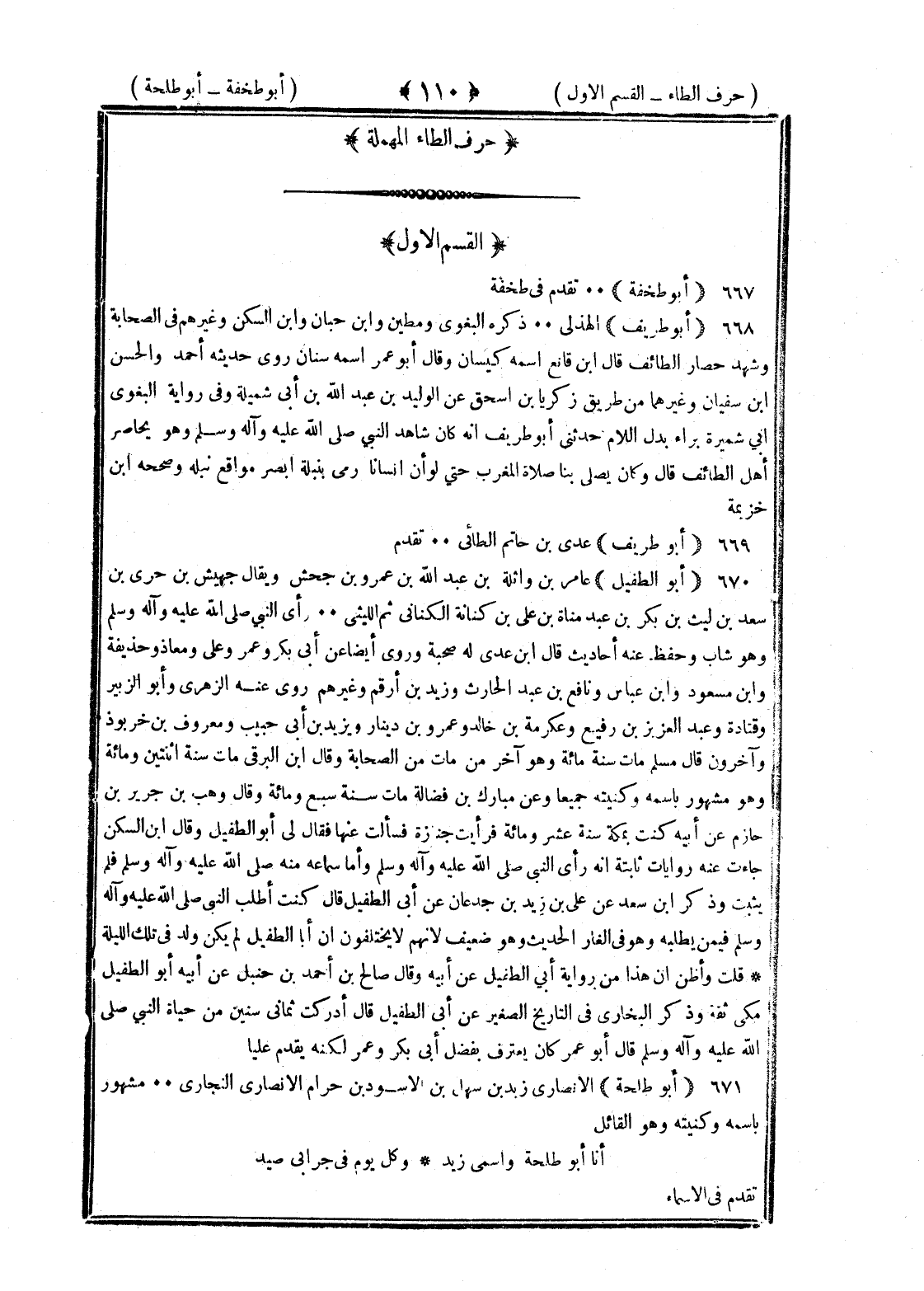 أبو طخفة تقدم في طخفة أبو طريف الهذلي ذكره البغوي ومطين وابن حبان وابن السكن وغيرهم في الصحابة وشهد حصار الطائف قال بن قانع اسمه كيسان وقال أبو عمر اسمه سنان روى حديثه أحمد والحسن بن سفيان وغيرهما من طريق زكريا بن إسحاق عن الوليد بن عبد الله بن أبي شميلة وفي رواية البغوي أبو شميرة براء بدل اللام حدثني أبو طريف أنه كان شاهد النبي صلى الله عليه وسلم وهو يحاصر أهل الطائف قال وكان يصلي بنا صلاة المغرب حتى لو أن إنسان رمى بنبله أبعد مواقع نبله وصححه بن خزيمة أبو طريف عدي بن حاتم الطائي تقدم أبو الطفيل عامر بن واثلة بن عبد الله بن عمرو بن جحش ويقال جهيش بن جدي بن سعد بن ليث بن بكر عبد مناة بن علي بن كنانة الكناني ثم الليثي رأى النبي صلى الله عليه وسلم وهو شاب وحفظ عنه أحاديث قال بن عدي له صحبة وروى أيضا عن أبي بكر وعمر وعلي ومعاذ وحذيفة وابن مسعود وابن عباس ونافع بن عبد الحارث وزيد بن أرقم وغيرهم روى عنه الزهري وأبو الزبير وقتادة وعبد العزيز بن رفيع وعكرمة بن خالد وعمرو بن دينار ويزيد بن أبي حبيب ومعروف بن خربوذ وآخرون قال مسلم مات سنة مائة وهو آخر من مات من الصحابة وقال بن البرقي مات سنة اثنتين ومائة وهو مشهور باسمه وكنيته جميعا وعن مبارك بن فضالة مات سنة سبع ومائة وقال وهب بن جرير بن حازم عن أبيه كنت بمكة سنة عشر ومائة فرأيت جنازة فسألت عنها فقيل لي أبو الطفيل وقال بن السكن جاءت عنه روايات ثابتة أنه رأى النبي صلى الله عليه وسلم وأما سماعه منه صلى الله عليه وسلم فلم يثبت وذكر بن سعد عن علي بن زيد بن جدعان عن أبي الطفيل قال كنت أطلب النبي صلى الله عليه وسلم فيمن يطلبه وهو في الغار الحديث وهو ضعيف لأنهم لا يختلفون أن أبا الطفيل لم يكن ولد في تلك الليلة قلت وأظن أن هذا من رواية أبي الطفيل عن أبيه وقال صالح بن أحمد بن حنبل عن أبيه أبو الطفيل مكي ثقة وذكره البخاري في التاريخ الصغير عن أبي الطفيل قال أدركت ثمان سنين من حياة النبي صلى الله عليه وسلم قال أبو عمر كان يعترف بفضل أبي بكر وعمر لكنه يقدم عليا أبو طلحة الأنصاري زيد بن سهل بن الأسود بن حرام الأنصاري النجاري مشهور باسمه وكنيته وهو القائل أنا أبو طلحة واسمي زيد وكل يوم في جرابي صيد تقدم في الإسماء §