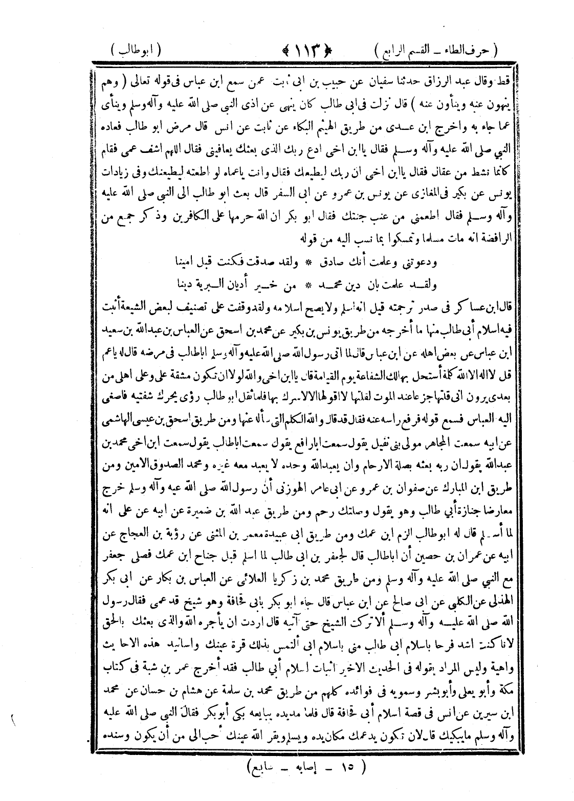 <113> قط وقال عبد الرزاق حدثنا سفيان عن حبيب بن أبي ثابت عمن سمع بن عباس في قوله تعالى وهم ينهون عنه وينأون عنه قال نزلت في أبي طالب كان ينهى عن أذى النبي صلى الله عليه وسلم وينأى عما جاء به وأخرج بن عدي من طريق الهيثم البكاء عن ثابت عن أنس قال مرض أبو طالب فعاده النبي صلى الله عليه وسلم فقال يا بن أخي ادع ربك الذي بعثك يعافني فقال اللهم اشف عمي فقام كأنما نشط من عقال فقال يا بن أخي إن ربك ليطيعك فقال وأنت يا عماه لو أطعته ليطيعنك وفي زيادات يونس بن بكير في المغازي عن يونس بن عمرو عن أبي السفر قال بعث أبو طالب إلى النبي صلى الله عليه وسلم فقال أطعمني من عنب جنتك فقال أبو بكر إن الله حرمها على الكافرين وذكر جمع من الرافضة أنه مات مسلما وتمسكوا بما نسب إليه من قوله ودعوتني وعلمت أنك صادق ولقد صدقت فكنت قبل أمينا ولقد علمت بأن دين محمد من خير أديان البرية دينا قال بن عساكر في صدر ترجمته قيل إنه أسلم ولا يصح إسلامه ولقد وقفت على تصنيف لبعض الشيعة أثبت فيه إسلام أبي طالب منها ما أخرجه من طريق يونس بن بكير عن محمد بن إسحاق عن العباس بن عبد الله بن سعيد بن عباس عن بعض أهله عن بن عباس قال لما أتى رسول الله صلى الله عليه وسلم أبا طالب في مرضه قال له يا عم قل لا إله إلا الله كلمة أستحل بها لك الشفاعة يوم القيامة قال يا بن أخي والله لولا أن تكون سبة علي وعلى أهلي من بعدي يرون أني قلتها جزعا عند الموت لقلتها لا اقولها إلا لأسرك بها فلما ثقل أبو طالب رؤي يحرك شفتيه فأصغى إليه العباس فسمع قوله فرفع رأسه عنه فقال قد قال والله الكلمة التي سأله عنها ومن طريق إسحاق بن عيسى الهاشمي عن أبيه سمعت المهاجر مولى بني نفيل يقول سمعت أبا رافع يقول سمعت أبا طالب يقول سمعت بن أخي محمد بن عبد الله يقول إن ربه بعثه بصلة الأرحام وأن يعبد الله وحده لا يعبد معه غيره ومحمد الصدوق الأمين ومن طريق بن المبارك عن صفوان بن عمرو عن أبي عامر الهوزني أن رسول الله صلى الله عليه وسلم خرج معارضا جنازة أبي طالب وهو يقول وصلتك رحم ومن طريق عبد الله بن ضميرة عن أبيه عن علي أنه لما أسلم قال له أبو طالب الزم بن عمك ومن طريق أبي عبيدة معمر بن المثنى عن رؤبة بن العجاج عن أبيه عن عمران بن حصين أن أبا طالب قال لجعفر بن أبي طالب لما أسلم قبل جناح بن عمك فصلى جعفر مع النبي صلى الله عليه وسلم ومن طريق محمد بن زكريا الغلابي عن العباس بن بكار عن أبي بكر الهذلي عن الكلبي عن أبي صالح عن بن عباس قال جاء أبو بكر بأبي قحافة وهو شيخ قد عمى فقال رسول الله صلى الله عليه وسلم ألا تركت الشيخ حتى آتيه قال أردت أن يأجره الله والذي بعثك بالحق لأنا كنت أشد فرحا بإسلام أبي طالب مني بإسلام أبي ألتمس بذلك قرة عينك وأسانيد هذه الأحاديث واهية وليس المراد بقوله في الحديث الأخير إثبات إسلام أبي طالب فقد أخرج عمر بن شبة في كتاب مكة وأبو يعلى وأبو بشر سمويه في فوائده كلهم من طريق محمد بن سلمة عن هشام بن حسان عن محمد بن سيرين عن أنس في قصة إسلام أبي قحافة قال فلما مد يده يبايعه بكى أبو بكر فقال النبي صلى الله عليه وسلم ما يبكيك قال لأن تكون يد عمك مكان يده ويسلم ويقر الله عينك أحب إلي من أين يكون وسنده §