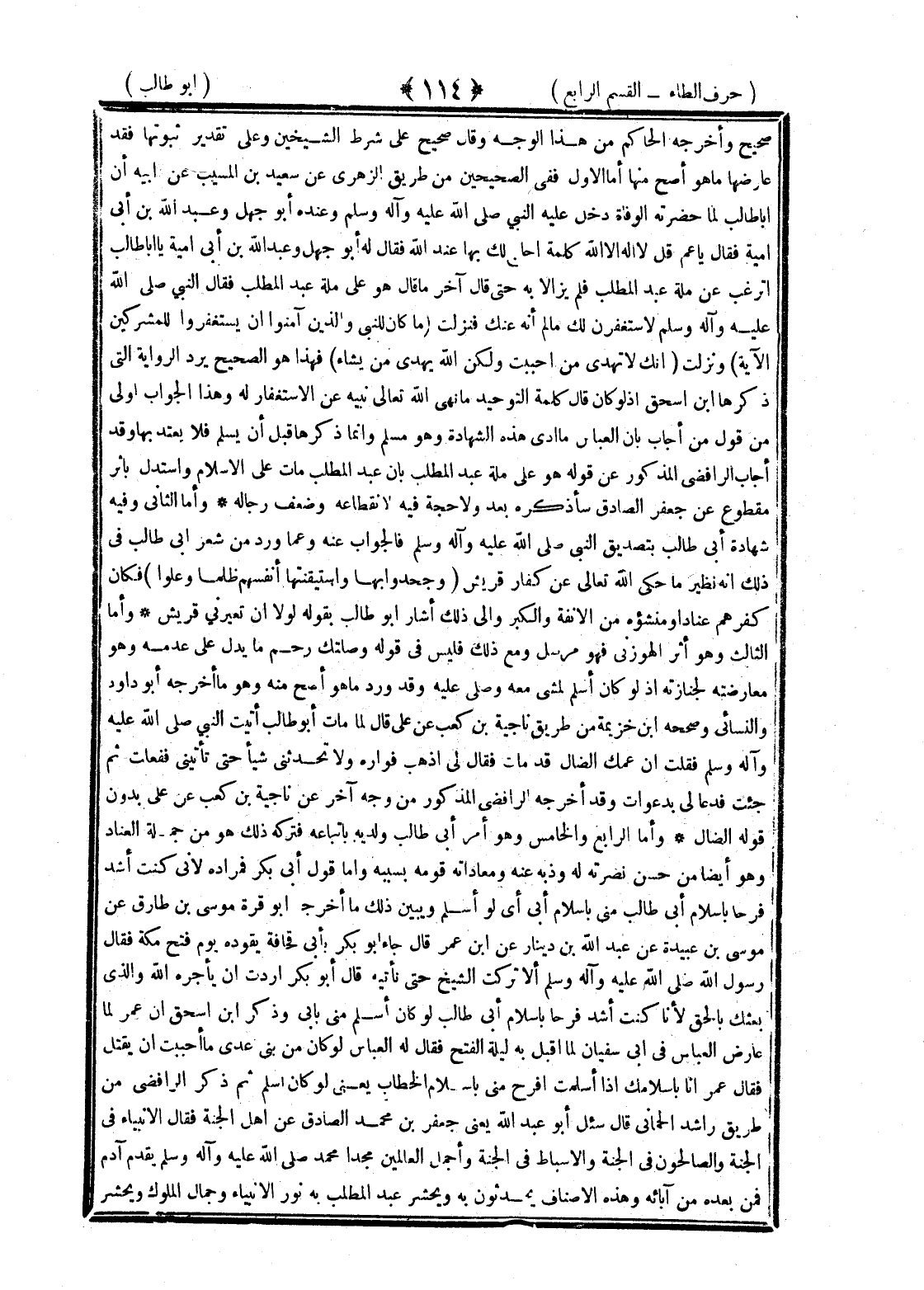 <114> صحيح وأخرجه الحاكم من هذا الوجه وقال صحيح على شرط الشيخين وعلى تقدير ثوبتها فقد عارضها ما هو أصح منها أما الأول ففي الصحيحين من طريق الزهري عن سعيد بن المسيب عن أبيه أن أبا طالب لما حضرته الوفاة دخل عليه النبي صلى الله عليه وسلم وعنده أبو جهل وعبد الله بن أبي أمية فقال يا عم قل لا إله إلا الله كلمة أحاج لك بها عند الله فقال له أبو جهل وعبد الله بن أبي أمية يا أبا طالب أترغب عن ملة عبد المطلب فلم يزالا به حتى قال آخر ما قال هو على ملة عبد المطلب فقال النبي صلى الله عليه وسلم لأستغفرن لك ما لم أنه عنك فنزلت ما كان للنبي والذين آمنوا أن يستغفروا للمشركين الآية ونزلت إنك لا تهدي من أحببت ولكن الله يهدي من يشاء فهذا هو الصحيح برد الرواية التي ذكرها بن إسحاق إذ لو كان قال كلمة التوحيد ما نهى الله تعالى نبيه عن الاستغفار له وهذا الجواب أولى من قول من أجاب بأن العباس ما أدى هذه الشهادة وهو مسلم وإنما ذكرها قبل أن يسلم فلا يعتد بها وقد أجاب الرافضي المذكور عن قوله وهو على ملة عبد المطلب بأن عبد المطلب مات على الإسلام واستدل بأثر مقطوع عن جعفر الصادق وسأذكره بعد ولا حجة فيه لانقطاعه وضعف رجاله وأما الثاني وفيه شهادة أبي طالب بتصديق النبي صلى الله عليه وسلم فالجواب عنه وعما ورد من شعر أبي طالب في ذلك أنه نظير ما حكى الله تعالى عن كفار قريش وجحدوا بها واستيقنتها أنفسهم ظلما وعلوا فكان كفرهم عنادا ومنشؤه من الأنفة والكبر وإلى ذلك أشار أبو طالب قوله لولا أن تعيرني قريش وأما الثالث وهو أثر الهوزني فهو مرسل ومع ذلك فليس في قوله وصلتك رحم ما يدل على إسلامه بل فيه ما يدل على عدمه وهو معارضته لجنازته ولو كان أسلم لمشى معه وصلى عليه وقد ورد ما هو أصح منه وهو ما أخرجه أبو داود والنسائي وصححه بن خزيمة من طريق ناجية بن كعب عن علي قال لما مات أبو طالب أتيت النبي صلى الله عليه وسلم فقلت إن عمك الضال قد مات فقال لي اذهب فواره ولا تحدثني شيئا حتى تأتين ففعلت ثم جئت فدعا لي بدعوات وقد أخرجه الرافضي المذكور من وجه آخر عن ناجية بن كعب عن علي بدون قوله الضال وأما الرابع والخامس وهو أمر أبي طالب ولديه باتبعاه فتركه ذلك هو من جملة العناد وهو أيضا من حسن نصرته له وذبه عنه ومعاداته قومه بسببه وأما قول أبي بكر فمراده لأنا كنت أشد فرحا بإسلام أبي طالب مني بإسلام أبي أي لو أسلم ويبين ذلك ما أخرجه أبو قرة موسى بن طارق عن موسى بن عبيدة عن عبد الله بن دينار عن بن عمر قال جاء أبو بكر بأبي قحافة يقوده يوم فتح مكة فقال رسول الله صلى الله عليه وسلم ألا تركت الشيخ حتى نأتيه قال أبو بكر أردت أن يأجره الله والذي بعثك بالحق لأنا كنت أشد فرحا بإسلام أبي طالب لو كان أسلم مني بأبي وذكر بن إسحاق أن عمر لما عارض العباس في أبي سفيان لما أقبل به ليلة الفتح فقال له العباس لو كان من بني عدي ما أحببت أن يقتل فقال عمر إنا بإسلامك إذا أسلمت أفرح مني بإسلام الخطاب يعني لو كان أسلم ثم ذكر الرافضي من طريق راشد الحماني قال سئل أبو عبد الله يعني جعفر بن محمد الصادق من أهل الجنة فقال الأنبياء في الجنة والصالحون في الجنة والأسباط في الجنة وأجل العالمين مجدا محمد صلى الله عليه وسلم يقدم آدم فمن بعده من آبائه وهذه الأصناف يحدثون به ويحشر عبد المطلب به نور الأنبياء وجمال الملوك ويحشر §