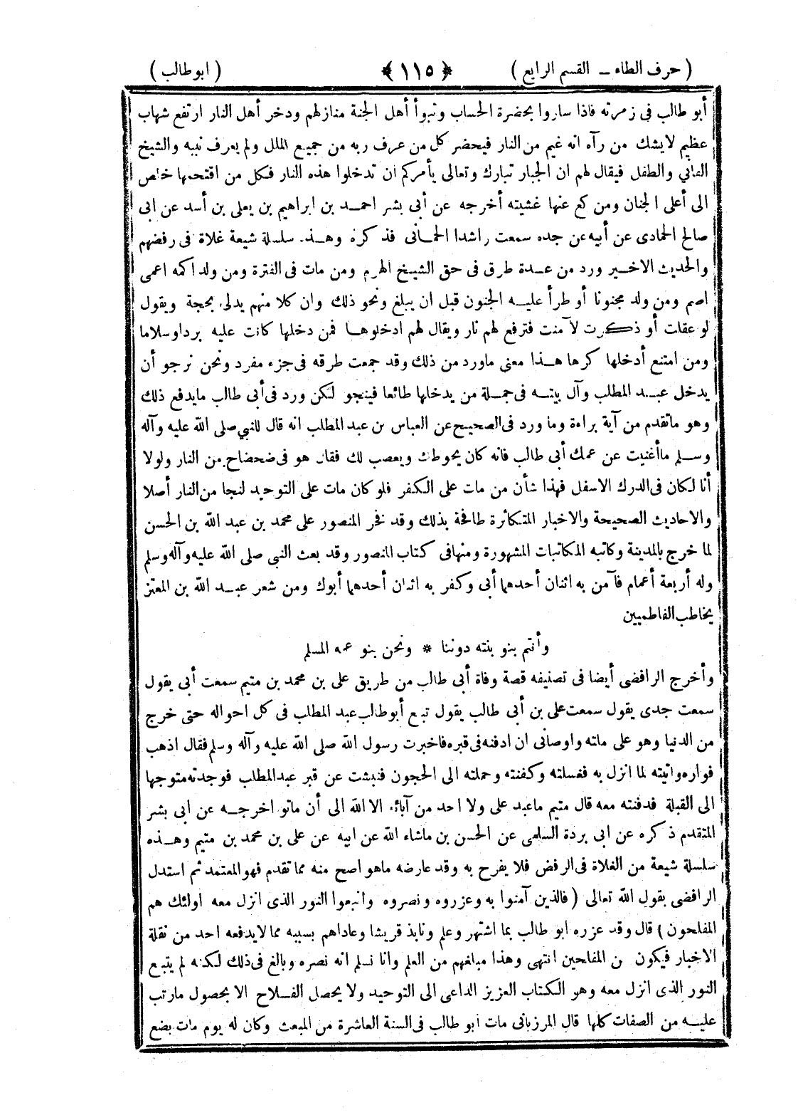 <115> أبو طالب في زمرته فإذا ساروا بحضرة الحساب وتبوأ أهل الجنة منازلهم ودحر أهل النار ارتفع شهاب عظيم لا يشك من رآه أنه غيم من النار فيحضر كل من عرف ربه من جميع الملل ولم يعرف نبيه ومن حشر أمة وحده والشيخ الفاني والطفل فيقال لهم إن الجبار تبارك وتعالى يأمركم أن تدخلوا هذه النار فكل من اقتحمها خلص إلى أعلى الجنة ومن كع عنها غشيته أخرجه عن أبي بشر أحمد بن إبراهيم بن يعلى بن أسد عن أبي صالح الحمادي عن أبيه عن جده سمعت راشد الحماني فذكره وهذه سلسلة شيعية غلاة في رفضهم والحديث الأخير ورد من عدة طرق في حق الشيخ الهرم ومن مات في الفترة ومن ولد أكمه أعمى أصم ومن ولد مجنونا أو طرأ عليه الجنون قبل أن يبلغ ونحو ذلك وأن كلا منهم يدلي بحجة ويقول لو عقلت أو ذكرت لآمنت فترفع لهم نار ويقال لهم ادخلوها فمن دخلها كانت عليه بردا وسلاما ومن امتنع أدخلها كرها هذا معنى ما ورد من ذلك وقد جمعت طرقه في جزء مفرد ونحن نرجو أن يدخل عبد المطلب وآل بيته في جملة من يدخلها طائعا فينجو لكن ورد في أبي طالب ما يدفع ذلك وهو ما تقدم من آية براءة وما ورد في الصحيح عن العباس بن عبد المطلب أنه قال للنبي صلى الله عليه وسلم ما أغنيت عن عمك أبي طالب فإنه كان يحوطك ويغضب لك فقال هو في ضحضاح من النار ولولا أنا لكان في الدرك الأسفل فهذا شأن من مات على الكفر فلو كان مات على التوحيد لنجا من النار أصلا والأحاديث الصحيحة والأخبار المتكاثرة طافحة بذلك وقد فخر المنصور على محمد بن عبد الله بن الحسن لما خرج بالمدينة وكاتبه المكاتبات المشهورة ومنها في كتاب المنصور وقد بعث النبي صلى الله عليه وسلم وله أربعة أعمام فآمن به اثنان أحدهما أبي وكفر به اثنان أحدهما أبوك ومن شعر عبد الله بن المعتز يخاطب الفاطميين وأنتم بنو بنته دوننا ونحن بنو عمه المسلم وأخرج الرافضي أيضا في تصنيفه قصة وفاة أبي طالب من طريق علي بن محمد بن متيم سمعت أبي يقول سمعت جدي يقول سمعت علي بن أبي طالب يقول تبع أبو طالب عبد المطلب في كل أحواله حتى خرج من الدنيا وهو على ملته وأوصاني أن أدفنه في قبره فأخبرت رسول الله صلى الله عليه وسلم فقال اذهب فواره وأتيته لما أنزل به فغسلته وكفنته وحملته إلى الحجون فنبشت عن قبر عبد المطلب فوجدته متوجها إلى القبلة فدفنته معه قال متيم ما عبد علي ولا أحد من آبائه إلا الله إلى أن ماتوا أخرجه عن أبي بشر المتقدم ذكره عن أبي بردة السلمي عن الحسن بن ما شاء الله عن أبيه عن علي بن محمد بن متيم وهذه سلسلة شيعية من الغلاة في الرفض فلا يفرح به وقد عارضه ما هو أصح منه مما تقدم فهو المعتمد ثم استدل الرافضي بقول الله تعالى فالذين آمنوا به وعزروه ونصروه واتبعوا النور الذي أنزل معه أولئك هم المفلحون قال وقد عزره أبو طالب بما اشتهر وعلم ونابذ قريشا وعاداهم بسببه مما لا يدفعه أحد من نقلة الأخبار فيكون من المفلحين انتهى وهذا مبلغهم من العلم وإنا نسلم أنه نصره وبالغ في ذلك لكنه لم يتبع النور الذي أنزل معه وهو الكتاب العزيز الداعي إلى التوحيد ولا يحصل الفلاح إلا بحصول ما رتب عليه من الصفات كلها قال المرزباني مات أبو طالب في السنة العاشرة من المبعث وكان له يوم مات بضع §