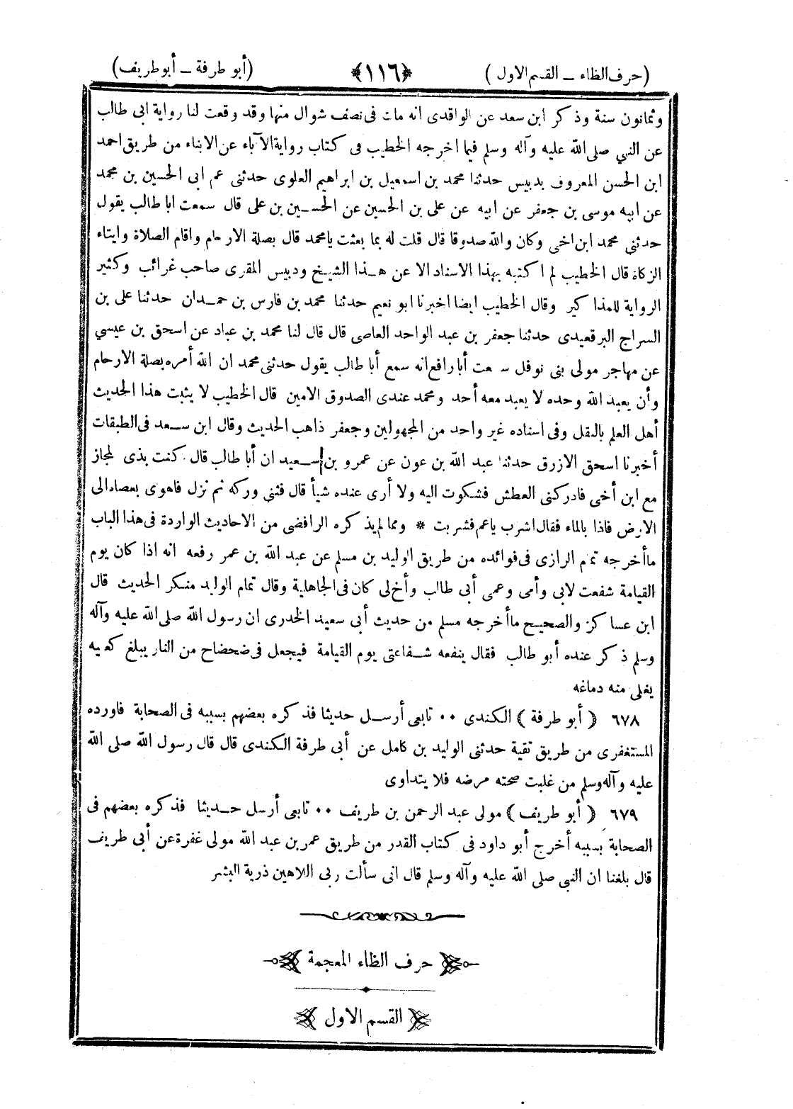 <116> وثمانون سنة وذكر بن سعد عن الواقدي أنه مات في نصف شوال منها وقد وقعت لنا رواية أبي طالب عن رسول الله صلى الله عليه وسلم فيما أخرجه الخطيب في كتاب رواية الآباء عن الأبناء من طريق أحمد بن الحسن المعروف بدبيس حدثنا محمد بن إسماعيل بن إبراهيم العلوي حدثني عم أبي الحسين بن محمد عن أبيه موسى بن جعفر عن أبيه عن علي بن الحسين عن الحسين بن علي قال سمعت أبا طالب يقول حدثني محمد بن أخي وكان والله صدوقا قال قلت له بم بعثت يا محمد قال بصلة الأرحام وإقام الصلاة وإيتاء الزكاة قال الخطيب لم أكتبه بهذا الإسناد إلا عن هذا الشيخ ودبيس المقرىء صاحب غرائب وكثير الرواية للمناكير وقال الخطيب أيضا أخبرنا أبو نعيم حدثنا محمد بن فارس بن حمدان حدثنا علي بن السراج البرقعيدي حدثنا جعفر بن عبد الواحد القاص قال قال لنا محمد بن عباد عن إسحاق بن عيسى عن مهاجر مولى بني نوفل سمعت أبا رافع أنه سمع أبا طالب يقول حدثني محمد أن الله أمره بصلة الأرحام وأن يعبد الله وحده ولا يعبد معه أحد ومحمد عندي الصدوق الأمين قال الخطيب لا يثبت هذا الحديث أهل العلم بالنقل وفي إسناده غير واحد من المجهولين وجعفر ذاهب الحديث وقال بن سعد في الطبقات أخبرنا إسحاق الأزرق حدثنا عبد الله بن عون عن عمرو بن سعيد أن أبا طالب قال كنت بذي المجاز مع بن أخي فأدركني العطش فشكوت إليه ولا أرى عنده شيئا قال فثنى وركه ثم نزل فأهوى بعصاه إلى الأرض فإذا بالماء فقال اشرب يا عم فشربت ومما لم يذكره الرافضي من الأحاديث الواردة في هذا الباب ما أخرجه تمام الرازي في فوائده من طريق الوليد بن مسلم عن عبد الله بن عمر رفعه أنه إذا كان يوم القيامة شفعت لأبي وأمي وعمي أبي طالب وأخ لي كان في الجاهلية وقال تمام الوليد منكر الحديث قال بن عساكر والصحيح ما أخرجه مسلم من حديث أبي سعيد الخدري أن رسول الله صلى الله عليه وسلم ذكر عنده أبو طالب فقال ينفعه شفاعتي يوم القيامة فيجعل في ضحضاح من النار يبلغ كعبيه يغلي منه دماغه أبو طرفة الكندي تابعي أرسل حديثا فذكره بعضهم بسببه في الصحابة فأورده المستغفري من طريق بقية حدثني الوليد بن كامل عن أبي طرفة الكندي قال قال رسول الله صلى الله عليه وسلم من غلبت صحته مرضه فلا يتداوى أبو طريف مولى عبد الرحمن بن طريف تابعي أرسل حديثا فذكره بعضهم في الصحابة بسببه أخرج أبو داود في كتاب القدر من طريق عمر بن عبد الله مولى عفرة عن أبي طريف قال بلغنا أن النبي صلى الله عليه وسلم قال إني سألت ربي للاهين من ذريه البشر