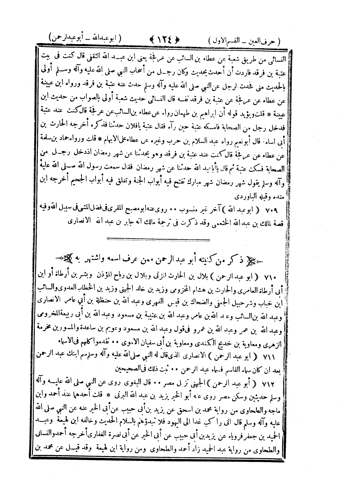<124> النسائي من طريق شعبة عن عطاء بن السائب عن عرفجة يعني بن عبد الله الثقفي قال كنت في بيت عتبة بن فرقد فأردت أن أحدث بحديث وكان رجل من أصحاب النبي صلى الله عليه وسلم أولى بالحديث مني فحدث الرجل عن النبي صلى الله عليه وسلم فذكر الحديث في فضل رمضان ورواه الثوري عن عطاء عن عرفجة عن عتبة عن رجل من أصحاب رسول الله صلى الله عليه وسلم ورواه محمد بن فضيل عن عطاء مثله لكن قال إن رجلا من أصحاب رسول الله صلى الله عليه وسلم حدث عنه عتبة بن فرقد ورواه بن عيينة عن عطاء عن عرفجة عن عتبة بن فرقد نفسه قال النسائي حديث شعبة أولى بالصواب من حديث بن عيينة قلت ويؤيد قوله ان إبراهيم بن طهمان رواه عن عطاء بن السائب عن عرفجة قال كنت عند عتبة فدخل رجل من الصحابة فأمسكه عتبة حين رآه فقال عتبة يا فلان حدثنا فذكره أخرجه الحارث بن أبي أسامة قال أبو نعيم رواه عبد السلام بن حرب وغيره عن عطاء على الإيهام قلت ورواه حماد بن سلمة عن عطاء عن عرفجة قال كنت عند عتبة بن فرقد وهو يحدثنا عن شهر رمضان إذ دخل رجل من الصحابة فسكت عتبة ثم قال يا أبا عبد الله حدثنا عن شهر رمضان فقال سمعت رسول الله صلى الله عليه وسلم يقول شهر رمضان شهر مبارك تفتح فيه أبواب الجنة وتغلق فيه أبواب الجحيم أخرجه بن منده وقبله الباوردي أبو عبد الله آخر غير منسوب روى عنه أبو مصبح المقرئي في فضل المشي في سبيل الله وفيه قصة لمالك بن عبد الله الخثعمي وقد ذكرت في ترجمة مالك أنه جابر بن عبد الله الأنصاري ذكر من كنيته أبو عبد الرحمن ممن عرف اسمه واشتهر به أبو عبد الرحمن بلال بن الحارث المزني وبلال بن رباح المؤذن وبشر بن أرطاة أو بن أبي أرطاة العامري والحارث بن هشام المخزومي وزيد بن خالد الجهني وزيد بن الخطاب العدوي والسائب بن خباب وشرحبيل الجعفي والضحاك بن قيس الفهري وعبد الله بن حنظلة بن أبي عامر الأنصاري وعبد الله بن السائب وعبد الله بن عامر وعبد الله بن عتيبة بن مسعود وعبد الله بن أبي ربيعة المخزومي وعبد الله بن عمر وعبد الله بن عمرو في قول وعبد الله بن مسعود وعويم بن ساعدة والمسور بن مخرمة الزهري ومعاوية بن حديج الكندي ومعاوية بن أبي سفيان الأموي تقدموا كلهم في الأسماء أبو عبد الرحمن الأنصاري الذي قال له النبي صلى الله عليه وسلم سم ابنك عبد الرحمن بعد أن كان سماه القاسم فسماه عبد الرحمن ثبت ذلك في الصحيحين أبو عبد الرحمن الجهني نزيل مصر قال البغوي روى عن النبي صلى الله عليه وسلم حديثين وسكن مصر وروى عنه أبو الخير مرثد بن عبد الله اليزني قلت أحدهما عند أحمد وابن ماجة والطحاوي من رواية محمد بن إسحاق عن يزيد بن أبي حبيب عن أبي الخير عنه عن النبي صلى الله عليه وسلم قال إني راكب غدا إلى اليهود فلا تبدءوهم بالسلام الحديث وخالفه بن لهيعة وعبد الحميد بن جعفر فروياه عن يزيد بن أبي حبيب عن أبي الخير عن أبي نضرة الغفاري أخرجه أحمد والنسائي والطحاوي من رواية عبد الحميد زاد أحمد والطحاوي ومن رواية بن لهيعة وقد قيل عن محمد بن §