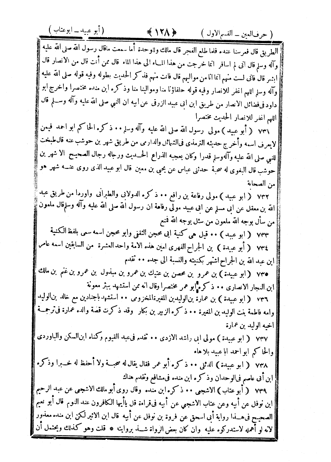 <128> الطريق قال فعرسنا عنده قال فلما طلع الفجر قال مالك وللوحدة أما سمعت ما قال رسول الله صلى الله عليه وسلم قال إني لم أسافر إنما خرجت من هذا الماء الى هذا الماء قال ممن أنت قال من الأنصار قال أبشر قال فإني لست منهم إنما أنا من مواليهم قال فأنت منهم فذكر الحديث بطوله وفيه قوله صلى الله عليه وسلم اللهم اغفر للأنصار وفيه قوله حلفاؤنا منا وموالينا منا وذكره بن منده مختصرا وأخرج أبو داود في فضائل الأنصار من طريق بن أبي عبيد الزرقي عن أبيه أن النبي صلى الله عليه وسلم قال اللهم اغفر للأنصار الحديث مختصرا أبو عبيد مولى رسول الله صلى الله عليه وسلم ذكره الحاكم أبو أحمد فيمن لا يعرف اسمه وأخرج حديثه الترمذي في الشمائل والدارمي من طريق شهر بن حوشب عنه قال طبخت للنبي صلى الله عليه وسلم قدرا وكان يعجبه الذراع الحديث ورجاله رجال الصحيح إلا شهر بن حوشب قال البغوي له صحبة حدثني عباس عن يحيى بن معين قال أبو عبيد الذي روى عنه شهر هو من الصحابة أبو عبيد مولى رفاعة بن رافع ذكره الدولابي والطبراني وأوردا من طريق عبد الله بن معقل عن أبي مسلم عن أبي عبيد مولى رفاعة أن رسول الله صلى الله عليه وسلم قال ملعون من سأل بوجه الله ملعون من سئل بوجه الله فمنع أبو عبيدة قيل هي كنية أبي محجن الثقفي وأبو محجن اسمه سمي بلفظ الكنية أبو عبيدة بن الجراح الفهري أمين هذه الأمة وأحد العشرة من من السابقين اسمه عامر بن عبد الله الجراح اشتهر بكنيته والنسبة الى جده تقدم أبو عبيدة بن عمرو بن محصن بن عتيك بن عمرو بن مبذول بن عمرو بن غنم بن مالك بن النجار الأنصاري ذكره أبو عمر مختصرا وقال إنه ممن استشهد ببئر معونة أبو عبيدة بن عمارة بن الوليد بن المغيرة المخزومي استشهد بأجنادين مع خالد بن الوليد وأمه فاطمة بنت الوليد بن المغيرة ذكره الزبير بن بكار وقد ذكرت قصة والده عمارة في ترجمة أخيه الوليد بن عمارة أبو عبيدة مولى أبي راشد الأزدي تقدم في عبدالقيوم وكناه بن السكن والباوردي والحاكم أبو أحمد أبا عبيد بلا هاء أبو عبيدة الديلي ذكره أبو عمر فقال يقال له صحبة ولا أحفظ له خبرا وذكره بن أبي عاصم في الوحدان وذكره بن منده في مسافع وتقدم هناك أبو عتاب الأشجعي ذكره بن منده وقال روى أبو مالك الأشجعي عن عبد الرحيم بن نوفل عن أبيه وعن عتاب الأشجعي عن أبيه في قراءة قل يا أيها الكافرون عند النوم قال أبو نعيم الصحيح في هذا رواية أبي إسحاق عن فروة بن نوفل عن أبيه قال بن الأثير لكن بن منده معذور لأنه لو أهمله لاستدركوه عليه وإن كان بعض الرواة شذ بروايته قلت وهو كذلك ويحتمل أن §