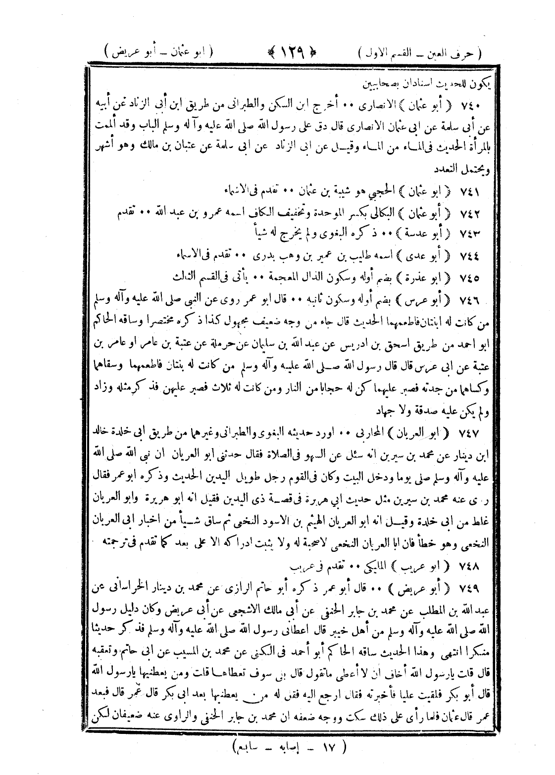 <129> يكون للحديث إسنادان بصحابيين أبو عثمان الأنصاري أخرج بن السكن والطبراني من طريق بن أبي الزناد عن أبيه عن أبي سلمة عن أبي عثمان الأنصاري قال دق علي رسول الله صلى الله عليه وسلم الباب وقد ألممت بالمرأة الحديث في الماء من الماء وقيل عن أبي الزناد عن أبي سلمة عن عتبان بن مالك وهو أشهر ويحتمل التعدد أبو عثمان الحجبي هو شيبة بن عثمان تقدم في الأسماء أبو عثمان البكالي بكسر الموحدة وتخفيف الكاف اسمه عمرو بن عبد الله تقدم أبو عديسة ذكره البغوي ولم يخرج له شيئا أبو عدي اسمه طليب بن عمير بن وهب بدري تقدم في الأسماء أبو عذرة بضم أوله وسكون الذال المعجمة يأتي في القسم الثالث أبو عرس بضم أوله وسكون ثانية قال أبو عمر روى عن النبي صلى الله عليه وسلم من كانت له ابنتان فأطعمهما الحديث قال جاء من وجه ضعيف مجهول كذا ذكره مختصرا وساقه الحاكم أبو أحمد من طريق إسحاق بن إدريس عن عبد الله بن سليمان عن حرملة عن عتبة بن عامر أو عامر بن عتبة عن أبي عرس قال قال رسول الله صلى الله عليه وسلم من كانت له ابنتان فأطعمهما وسقاهما وكساهما من جدته فصبر عليهما كن له حجابا من النار ومن كانت له ثلاث فصبر عليهن فذكر مثله وزاد ولم يكن عليه صدقة ولا جهاد أبو العريان المحاربي أورد حديثه البغوي والطبراني وغيرهما من طريق أبي خلدة خالد بن دينار عن محمد بن سيرين أنه سئل عن السهو في الصلاة فقال حدثني أبو العريان أن نبي الله صلى الله عليه وسلم صلى يوما ودخل البيت وكان في القوم رجل طويل اليدين الحديث وذكره أبو عمر فقال روى عنه محمد بن سيرين مثل حديث أبي هريرة في قصة ذي اليدين فقيل إنه أبو هريرة وأبو العريان غلط من أبي خلدة وقيل إنه أبو العريان الهيثم بن الأسود النخعي ثم ساق شيئا من أخبار أبي العريان النخعي وهو خطأ فإن أبا العريان النخعي لا صحبة له ولا يثبت إدراكه إلا على بعد كما تقدم في ترجمته أبو عريب المليكي تقدم في عريب أبو عريض قال أبو عمر ذكره أبو حاتم الرازي عن محمد بن دينار الخراساني عن عبد الله بن المطلب عن محمد بن جابر الحنفي عن أبي مالك الأشجعي عن أبي عريض وكان دليل رسول الله صلى الله عليه وسلم من أهل خيبر قال أعطاني رسول الله صلى الله عليه وسلم فذكر حديثا منكرا انتهى وهذا الحديث ساقه الحاكم أبو أحمد في الكنى عن محمد بن المسيب عن أبي حاتم وتعقبه قال قلت يا رسول الله أخاف ألا أعطي ما تقول قال بلى سوف تعطاها قلت ومن يعطينيها يا رسول الله قال أبو بكر فلقيت عليا فأخبرته فقال ارجع إليه فقل له من يعطينيها بعد أبي بكر قال عمر قال فبعد عمر قال عثمان فلما رأى ذلك سكت ووجه ضعفه أن محمد بن جابر الحنفي والراوي عنه ضعيفان لكن §