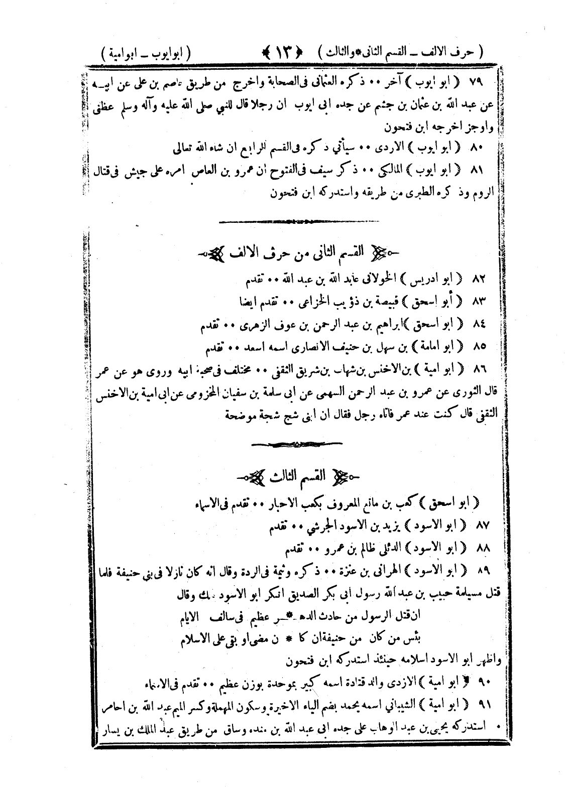 <13> أبو أيوب آخر ذكره العثماني في الصحابة وأخرج من طريق عاصم بن علي عن أبيه عن عبد الله بن عثمان بن خثيم عن جده أبي أيوب أن رجلا قال للنبي صلى الله عليه وسلم عظني وأوجز بن فتحون أبو أيوب الأزدي سيأتي ذكره في القسم الرابع إن شاء الله تعالى أبو أيوب المالكي ذكر سيف في الفتوح أن عمرو بن العاص أمره على جيش في قتال الروم وذكره الطبري من طريقه واستدركه بن فتحون القسم الثاني من حرف الألف أبو إدريس الخولاني عائذ الله بن عبيد الله تقدم أبو إسحاق قبيصة بن ذؤيب الخزاعي تقدم أيضا أبو إسحاق إبراهيم بن عبد الرحمن بن عوف الزهري تقدم أبو أمامة بن سهل بن حنيف الأنصاري اسمه أسعد تقدم أبو أمية بن الأخنس بن شهاب بن شريق الثقفي مختلف في صحبة أبيه وروى هو عن عمر قال الثوري عن عمرو بن عبد الرحمن السهمي عن أبي سلمة بن سفيان المخزومي عن أبي أمية بن الأخنس الثقفي قال كنت عند عمر فأتاه رجل فقال إن ابني شج شجة موضحة القسم الثالث أبو إسحاق كعب بن ماتع المعروف بكعب الأحبار تقدم في الأسماء أبو الأسود يزيد بن الأسود الجرشي تقدم أبو الأسود الدئلي ظالم بن عمرو تقدم أبو الأسود الهزاني من عنزة ذكره وثيمة في الردة وقال إنه كان نازلا في بني حنيفة فلما قتل مسيلمة حبيب بن عبد الله رسول أبي بكر الصديق انكر أبو الأسود ذلك وقال إن قتل الرسول من حادث الدهر عظيم في سالف الأيام بئس من كان من حنيفة إن كان مضى أو بقي على الإسلام وأظهر أبو الأسود إسلامه حينئذ استدركه بن فتحون أبو أمية الأسدي والد قتادة اسمه كبير بموحدة بوزن عظيم تقدم في الأسماء أبو أمية الشعباني اسمه يحمد بضم الياء الأخيرة وسكون المهملة وكسر الميم وقيل عبد الله بن آخامر استدركه يحيى بن عبد الوهاب على جده أبي عبد الله بن منده وساق من طريق عبد الملك بن يسار §