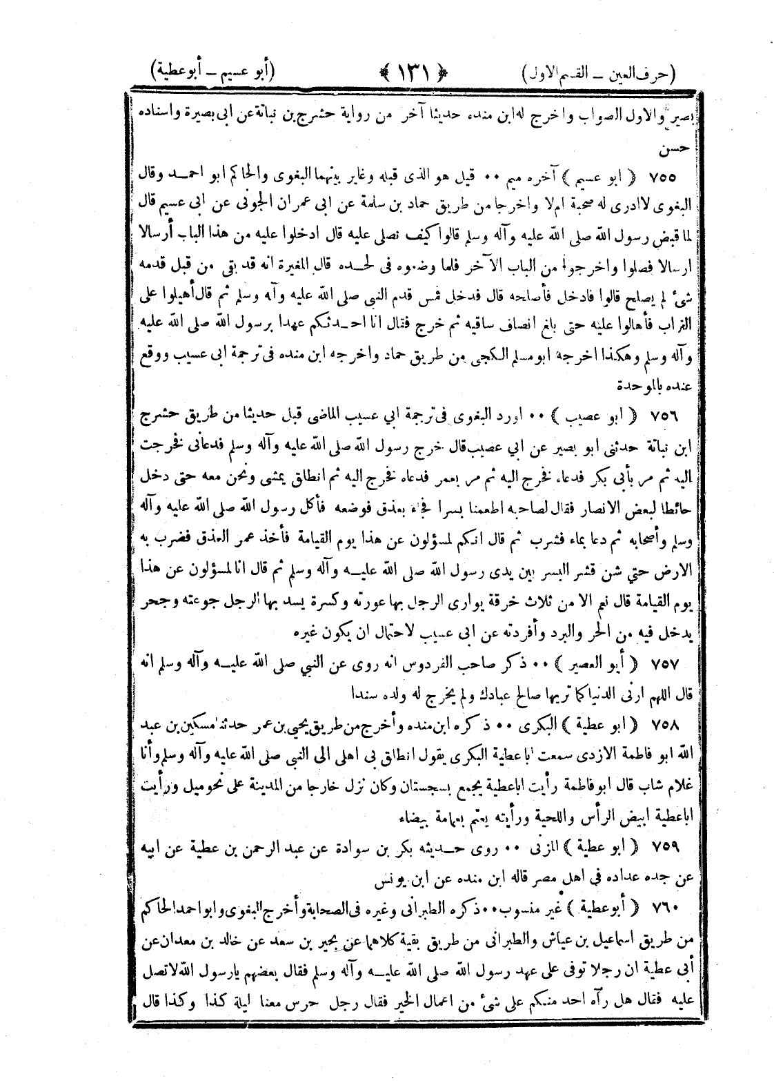 <131> بصير والأول الصواب وأخرج له بن منده حديثا آخر من رواية حشرج بن نباتة عن أبي بصيرة وإسناده حسن أبو عسيم آخره ميم قيل هو الذي قبله وغاير بينهما البغوي والحاكم أبو أحمد وقال البغوي لا أدري له صحبة أم لا وأخرجا من طريق حماد بن سلمة عن أبي عمران الجوني عن أبي عسيم قال لما قبض رسول الله صلى الله عليه وسلم قالوا كيف نصلي عليه قال ادخلوا عليه من هذا الباب أرسالا أرسالا فصلوا واخرجوا من الباب الآخر فلما وضعوه في لحده قال المغيرة إنه قد بقي من قبل قدمه شيء لم يصلح قالوا فادخل فأصلحه قال فدخل فمس قدم النبي صلى الله عليه وسلم ثم قال أهيلوا علي التراب فأهالوا عليه حتى بلغ أنصاف ساقيه ثم خرج فقال أنا أحدثكم عهدا برسول الله صلى الله عليه وسلم وهكذا أخرجه أبو مسلم الكجي من طريق حماد وأخرجه بن منده في ترجمة عسيب ووقع عنده بالموحدة أبو عصيب أورد البغوي في ترجمة أبي عسيب الماضي قبل حديثا من طريق حشرج بن نباتة حدثني أبو بصير عن أبي عصيب قال خرج رسول الله صلى الله عليه وسلم فدعاني فخرجت إليه ثم مر بأبي بكر فدعاه فخرج إليه ثم مر بعمر فدعاه فخرج إليه ثم انطلق يمشي ونحن معه حتى دخل حائطا لبعض الأنصار فقال لصاحبه أطعمنا بسرا فجاء بعذق فوضعه فأكل رسول الله صلى الله عليه وسلم وأصحابه ثم دعا بماء فشرب ثم قال إنكم لمسئولون عن هذا يوم القيامة فأخذ عمر العذق فضرب به الأرض حتى تناثر البسر بين يدي رسول الله صلى الله عليه وسلم ثم قال إنا لمسئولون عن هذا يوم القيامة قال نعم إلا من ثلاث خرقة يواري الرجل بها عورته وكسرة يسد بها الرجل جوعته وجحر يدخل فيه من الحر والبرد وأفردته عن أبي عسيب لاحتمال أن يكون غيره أبو العصير ذكر صاحب الفردوس أنه روى عن النبي صلى الله عليه وسلم أنه قال اللهم أرني الدنيا كما تريها صالح عبادك ولم يخرج له ولده سندا أبو عطية البكري ذكره بن منده وأخرج من طريق يحيى بن عمر حدثنا مسلم عن عبد الله أبو فاطمة الأزدي سمعت أبا عطية البكري يقول انطلق بي أهلي إلى النبي صلى الله عليه وسلم وأنا غلام شاب قال أبو فاطمة رأيت أبا عطية يجمع بسجستان وكان نزل خارجا من المدينة على نحو ميل ورأيت أبا عطية أبيض الرأس واللحية ورأيته يعتم بعمامة بيضاء أبو عطية المزني روى حديثه بكر بن سوادة عن عبد الرحمن بن عطية عن أبيه عن جده عداده في أهل مصر قاله بن منده عن بن يونس أبو عطية غير منسوب ذكره الطبراني وغيره في الصحابة وأخرج البغوي وأبو أحمد الحاكم من طريق إسماعيل بن عياش والطبراني من طريق بقية كلاهما عن بجير بن سعد عن خالد بن معدان عن أبي عطية أن رجلا توفى على عهد رسول الله صلى الله عليه وسلم فقال بعضهم يا رسول الله لا تصل عليه فقال هل رآه أحد منكم على شيء من عمل الخير فقال رجل حرس معنا ليلة كذا وكذا قال §