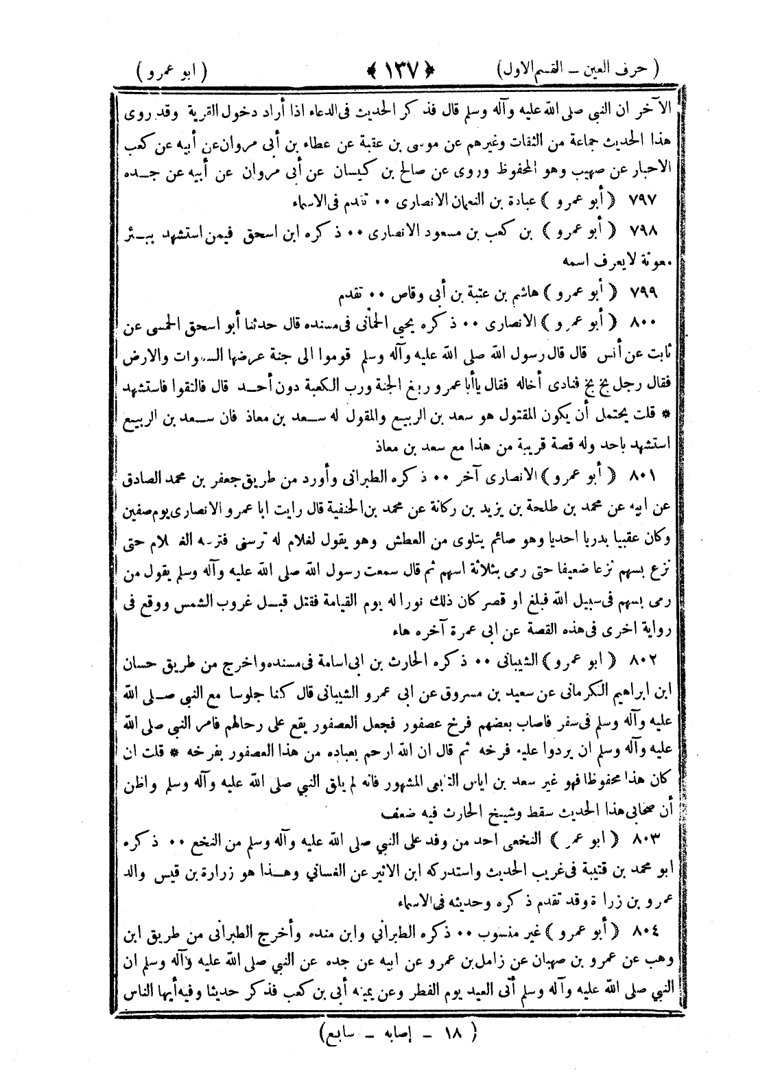 <137> الآخر أن النبي صلى الله عليه وسلم قال فذكر الحديث في الدعاء إذا أراد دخول القرية وقد روى هذا الحديث جماعة من الثقات وغيرهم عن موسى بن عقبة عن عطاء بن مروان عن أبيه عن كعب الأحبار عن صهيب وهو المحفوظ وروى عن صالح بن كيسان عن أبي مروان عن أبيه عن جده أبو عمرو عبادة بن النعمان الأنصاري تقدم في الأسماء أبو عمرو بن كعب بن مسعود الأنصاري ذكره بن إسحاق فيمن استشهد ببئر معونة لا يعرف اسمه أبو عمرو هاشم بن عتبة بن أبي وقاص تقدم أبو عمرو الأنصاري ذكره يحيى الحماني في مسنده قال حدثنا أبو إسحاق الحميسي عن ثابت عن أنس قال قال رسول الله صلى الله عليه وسلم قوموا إلى جنة عرضها السماوات والأرض فقال رجل بخ بخ فنادى أخا له فقال يا أبا عمرو ربح البيع الجنة ورب الكعبة دون أحد قال فالتقوى فاستشهد قلت يحتمل أن يكون المقتول هو سعد بن الربيع والمقول له سعد بن معاذ فإن سعد بن الربيع استشهد بأحد وله قصة قريبة من هذا مع سعد بن معاذ أبو عمرو الأنصاري آخر ذكره الطبراني وأورد من طريق جعفر بن محمد الصادق عن أبيه عن محمد بن طلحة بن يزيد بن ركانة عن محمد بن الحنفية قال رأيت أبا عمرو الأنصاري يوم صفين وكان عقبيا بدريا أحديا وهو صائما يتلوى من العطش وهو يقول لغلام له ترسني فترسه الغلام حتى نزع بسهم نزعا ضعيفا حتى رمى بثلاثة أسهم ثم قال سمعت رسول الله صلى الله عليه وسلم يقول من رمى بسهم في سبيل الله فبلغ أو قصر كان ذلك نورا له يوم القيامة فقتل قبل غروب الشمس ووقع في رواية أخرى في هذه القصة عن أبي عمرة آخره هاء أبو عمرو الشيباني ذكره الحارث بن أبي أسامة في مسنده وأخرج من طريق حسان بن إبراهيم الكرماني عن سعيد بن مسروق عن أبي عمرو الشيباني قال كنا جلوسا مع النبي صلى الله عليه وسلم في سفر فأصاب بعضهم فرخ عصفور فجعل العصفور يقع على رحالهم فأمر النبي صلى الله عليه وسلم أن يردوا عليه فرخه ثم قال إن الله أرحم بعباده من هذا العصفور بفرخه قلت إن كان هذا محفوظا فهو غير سعد بن إياس التابعي المشهور فإنه لم يلق النبي صلى الله عليه وسلم وأظن أن صحابي هذا الحديث سقط وشيخ الحارث فيه ضعف أبو عمرو النخعي أحد من وفد على النبي صلى الله عليه وسلم من النخع ذكره أبو محمد بن قتيبة في غريب الحديث وذكر له رؤيا واستدركه بن الأثير عن الغساني وهذا هو زرارة بن قيس والد عمرو بن زرارة وقد تقدم ذكره وحديثه في الأسماء أبو عمرو غير منسوب ذكره الطبراني وابن منده وأخرج الطبراني من طريق بن وهب عن عمرو بن صهبان عن زامل بن عمرو عن أبيه عن جده عن النبي صلى الله عليه وسلم أن النبي صلى الله عليه وسلم أتى العبد يوم الفطر وعن يمينه أبي بن كعب فذكر حديثا وفيه أيها الناس §