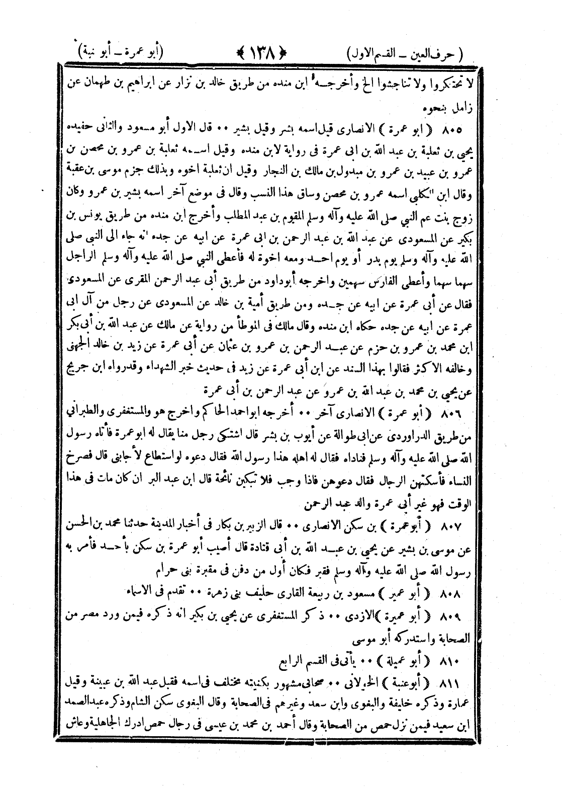 <138> لا تحتكروا ولا تناجشوا الخ وأخرجه بن منده من طريق خالد بن نزار عن إبراهيم بن طهمان عن زامل بنحوه أبو عمرة الأنصاري قيل اسمه بشر وقيل بشير قال الأول أبو مسعود والثاني حفيده يحيى بن ثعلبة بن عبد الله بن أبي عمرة في رواية لابن منده وقيل اسمه ثعلبة بن عمرو بن محصن بن عمرو بن عبيد بن عمرو بن مبذول بن مالك بن النجار وقيل إن ثعلبة أخوه وبذلك جزم موسى بن عقبة وقال بن الكلبي اسمه عمرو بن محصن وساق هذا النسب وقال في موضع آخر اسمه بشير بن عمرو وكان زوج بنت عم النبي صلى الله عليه وسلم المقوم بن عبد المطلب وأخرج بن منده من طريق يونس بن بكير عن المسعودي عن عبد الله بن عبد الرحمن بن أبي عمرة عن أبيه عن جده أنه جاء إلى النبي صلى الله عليه وسلم يوم بدر أو يوم أحد ومعه إخوة له فأعطى النبي صلى الله عليه وسلم الرجل سهما سهما وأعطى الفارس سهمين وأخرجه أبو داود من طريق أبي عبد الرحمن المقري عن المسعودي فقال عن أبي عمرة عن أبيه عن جده ومن طريق أمية بن خالد عن المسعودي عن رجل من آل أبي عمرة عن أبيه عن جده حكاه بن منده وقال مالك في الموطأ من رواية عن مالك بن عبد الله بن أبي بكر بن محمد بن عمرو بن حزم عن أبيه عن عبد الرحمن بن عمرو بن عثمان عن أبي عمرة عن زيد بن خالد الجهني وخالفه الأكثر فقالوا بهذا السند عن بن أبي عمرة عن زيد في حديث خير الشهداء وقد رواه بن جريج عن يحيى بن محمد بن عبد الله بن عمرو عن عبد الرحمن أبي عمرة أبو عمرة الأنصاري آخر أخرجه أبو أحمد الحاكم وأخرج هو والمستغفري والطبراني من طريق الدراوردي عن أبي طوالة عن أيوب بن بشر قال اشتكى رجل منا يقال له أبو عمرة فأتاه رسول الله صلى الله عليه وسلم فناداه فقال له أهله هذا رسول الله فقال دعوه لو استطاع لأجابني قال فصرخ النساء فأسكتهن الرجال فقال دعوهن فإذا وجب فلا تبكين باكية قال بن عبد البر إن كان مات في هذا الوقت فهو غير أبي عمرة والد عبد الرحمن أبو عمرة بن سكن الأنصاري قال الزبير بن بكار في أخبار المدينة حدثنا محمد بن الحسن عن موسى بن بشير عن يحيى بن عبد الله بن أبي قتادة قال أصيب أبو عمرة بن سكن بأحد فأمر به رسول الله صلى الله عليه وسلم فقبر فكان أول من دفن في مقبرة بني حرام أبو عمير مسعود بن ربيعة القاري حليف بني زهرة تقدم في الأسماء أبو عميرة الأزدي ذكر المستغفري عن يحيى بن بكير أنه ذكره فيمن ورد مصر من الصحابة واستدركه أبو موسى أبو عميلة يأتي في القسم الرابع أبو عنبة الخولاني صحابي مشهور بكنيته مختلف في اسمه فقيل عبد الله بن عنبة وقيل عمارة وذكره خليفة والبغوي وابن سعد وغيرهم في الصحابة وقال البغوي سكن الشام وذكره عبد الصمد بن سعيد فيمن نزل حمص من الصحابة وقال أحمد بن محمد بن عيسى في رجل حمص أدرك الجاهلية وعاش §