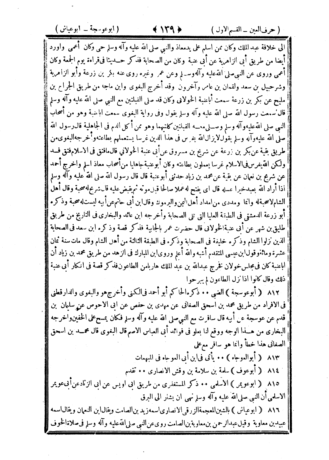 <139> إلى خلافة عبد الملك وكان ممن أسلم على يد معاذ والنبي صلى الله عليه وسلم حي وكان أعمى وأورد أيضا من طريق أبي الزاهرية عن أبي عنبة وكان من الصحابة فذكر حديثا في قراءة الجمعة يوم الجمعة وكان أعمى وروى عن النبي صلى الله عليه وسلم وعن عمر وغيره روى عنه بكر بن زرعة وأبو الزاهرية وشرحبيل بن سعد ولقمان بن عامر وآخرون وقد أخرج البغوي وابن ماجة من طريق الجراح بن مليح عن بكر بن زرعة سمعت أبا عنبة الخولاني وكان قد صلى القبلتين مع النبي صلى الله عليه وسلم قال سمعت رسول الله صلى الله عليه وسلم يقول وفي رواية البغوي سمعت أبا عنبة وهو من أصحاب النبي صلى الله عليه وسلم وصلى معه القبلتين كلتيهما وهو ممن أكل الدم في الجاهلية قال سمعت رسول الله صلى الله عليه وسلم يقول لا يزال الله يغرس في هذا الدين غرسا يستعملهم بطاعته وأخرجه البغوي من طريق بقية عن بكر بن زرعة عن شريح بن مسروق عن أبي عنبة الخولاني قال ما فتق في الإسلام فتق فسد ولكن الله يغرس في الإسلام غرسا يعملون بطاعته وكان أبو عنبة جاهليا من أصحاب معاذ أسلم وأخرج أحمد عن شريح بن نعمان عن بقية عن محمد بن زياد حدثني أبو عنبة قال قال رسول الله صلى الله عليه وسلم إذا أراد الله بعبد خيرا عسله قال أي يفتح له عملا صالحا قبل موته ثم يقبض عليه قال شريح له صحبة وقال أهل الشام لا صحبة له وإنما هو مددي من أمداد أهل اليمن واليرموك وقال بن أبي حاتم عن أبيه ليست له صحبة وذكره أبو زرعة الدمشقي في الطبقة العليا التي تلي الصحابة وأخرجه بن عائذ والبخاري في التاريخ من طريق طليق بن شهر عن أبي عنبة الخولاني قال حضرت عمر بالجابية فذكر قصة وذكره بن سعد في الصحابة الذين نزلوا الشام وذكره خليفة في الصحابة وذكره في الطبقة الثالثة من أهل الشام وقال مات سنة ثمان عشرة ومائة وقول بن عيسى المتقدم أشبه والله أعلم وروى بن المبارك في الزهد من طريق محمد بن زياد أن أبا عنبة كان في مجلس خولان فخرج عبد الله بن عبد الملك هاربا من الطاعون فذكر قصة في إنكار أبي عنبة ذلك وقال كانوا إذا نزل الطاعون لم يبرحوا أبو عوسجة الضبي ذكره الحاكم أبو أحمد في الكنى وأخرج هو والبغوي والدارقطني في الأفراد من طريق محمد بن إسحاق الصغاني عن مهدي بن حفص عن أبي الأحوص عن سليمان بن قرم عن عوسجة عن أبيه قال سافرت مع النبي صلى الله عليه وسلم فكان يمسح على الخفين وأخرجه البخاري من هذا الوجه ووقع لنا بعلو في فوائد أبي العباس الأصم قال البغوي قال محمد بن إسحاق الصغاني هذا خطأ وإنما هو سافر مع علي أبو العوجاء يأتي في بن أبي العوجاء في المبهمات أبو عوف سلمة بن سلامة بن وقش الأنصاري تقدم أبو عويمر الأسلمي ذكر المستغفري من طريق أبي أويس عن أبي الزناد عن أبي عويمر الأسلمي أن النبي صلى الله عليه وسلم نهى عن أن يشار إلى البرق أبو عياش بالشين المعجمة الزرقي الأنصاري اسمه زيد بن الصامت ويقال بن النعمان ويقال اسمه عبيد بن معاوية وقيل عبد الرحمن بن معاوية بن الصامت روى عن النبي صلى الله عليه وسلم في صلاة الخوف §