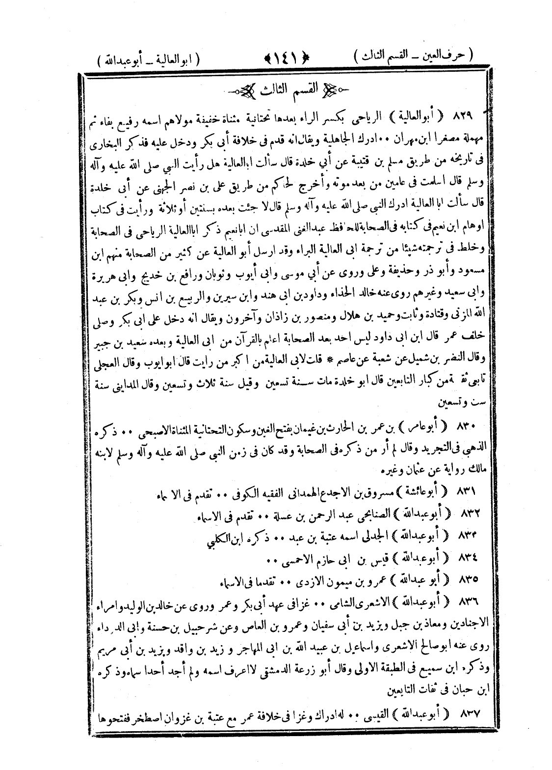 <141> القسم الثالث أبو العالية الرياحي بكسر الراء بعدها تحتانية مثناة خفيفة مولاهم اسمه رفيع بفاء ثم مهملة مصغرا بن مهران أدرك الجاهلية ويقال إنه قدم في خلافة أبي بكر ودخل عليه فذكر البخاري في تاريخه من طريق مسلم بن قتيبة عن أبي خلدة قال سألت أبا العالية هل رأيت النبي صلى الله عليه وسلم قال أسلمت في عامين من بعد موته وأخرج الحاكم من طريق علي بن نصر الجهني عن أبي خلدة قال سألت أبا العالية أدركت النبي صلى الله عليه وسلم قال لا جئت بعده بسنتين أو ثلاثة ورأيت في كتاب أوهام أبي نعيم في كتابه في الصحابة للحافظ عبد الغني المقدسي أن أبا نعيم ذكر أبا العالية الرياحي في الصحابة وخلط في ترجمته شيئا من ترجمة أبي العالية البراء وقد أرسل أبو العالية عن كثير من الصحابة منهم بن مسعود وأبو ذر وحذيفة وعلي وروى عن أبي موسى وأبي أيوب وثوبان ورافع بن خديج وأبي هريرة وأبي سعيد وغيرهم روى عنه خالد الحذاء وداود بن أبي هند وابن سيرين والربيع بن أنس وبكر بن عبد الله المزني وقتادة وثابت وحميد بن هلال ومنصور بن زاذان وآخرون ويقال إنه دخل على أبي بكر وصلى خلف عمر قال بن أبي داود ليس أحد بعد الصحابة أعلم بالقرآن من أبي العالية وبعده سعيد بن جبير وقال النضر بن شميل عن شعبة عن عاصم قلت لأبي العالية من أكبر من رأيت قال أبو أيوب وقال العجلي تابعي ثقة من كبار التابعين قال أبو خلدة مات سنة تسعين وقيل سنة ثلاث وتسعين وقال المدائني سنة ست وتسعين وقال أبو عمر الضرير مات سنة ثمان وتسعين وبه جزم بن حبان أبو عامر بن عمرو بن الحارث بن غيمان بفتح الغين وسكون التحتانية المثناة الأصبحي ذكره الذهبي في التجريد وقال لم أر من ذكره في الصحابة وقد كان في زمن النبي صلى الله عليه وسلم لابنه مالك رواية عن عثمان وغيره أبو عائشة مسروق بن الأجدع الهمداني الفقيه الكوفي تقدم في الأسماء أبو عبد الله الصنابحي عبد الرحمن بن عسيلة تقدم في الأسماء أبو عبد الله الجدلي اسمه عبد بن عبد ذكره بن الكلبي أبو عبد الله قيس بن أبي حازم الأحمسي أبو عبد الله بن ميمون الأزدي تقدما في الأسماء أبو عبد الله الأشعري غزا في عهد أبي بكر وعمر وروى عن خالد بن الوليد وأمراء الأجناد ومعاذ بن جبل ويزيد بن أبي سفيان وعمرو بن العاص وعن شرحبيل بن حسنة وأبي الدرداء روى عنه أبو صالح الأشعري وإسماعيل بن عبيد الله بن أبي المهاجر وزيد بن واقد ويزيد بن أبي مريم وذكره بن سميع في الطبقة الأولى وقال أبو زرعة الدمشقي لا أعرف اسمه ولم أجد أحدا سماه وذكره بن حبان في ثقات التابعين أبو عبد الله القيسي له إدراك وغزا في خلافة عمر مع عتبة بن غزوان اصطخر ففتحوها §